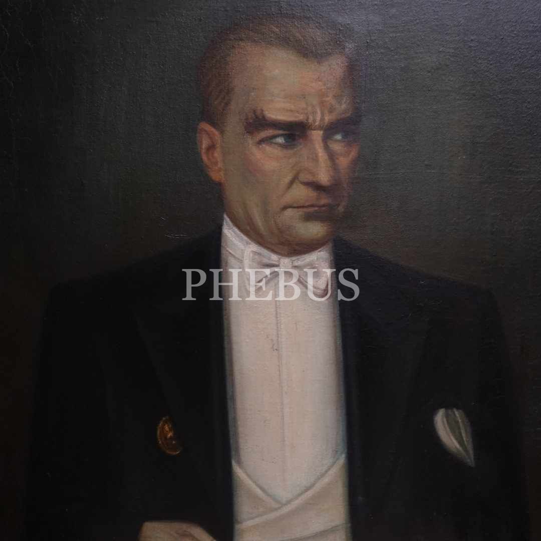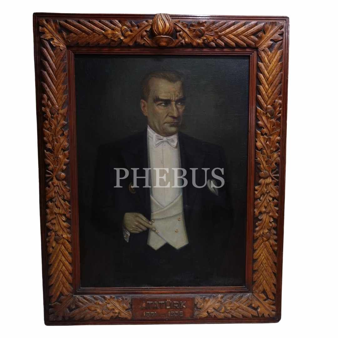 Zeki Görçiz imzalı Mustafa Kemal Atatürk portresi, tuval üzerine yağlı boya, "ATATÜRK 1881-1938" ibareli, yaprak ve palamut motifli, yanan meşale dekorlu ceviz dönem çerçevesinde, çerçevesiyle birlikte 94x155 cm...