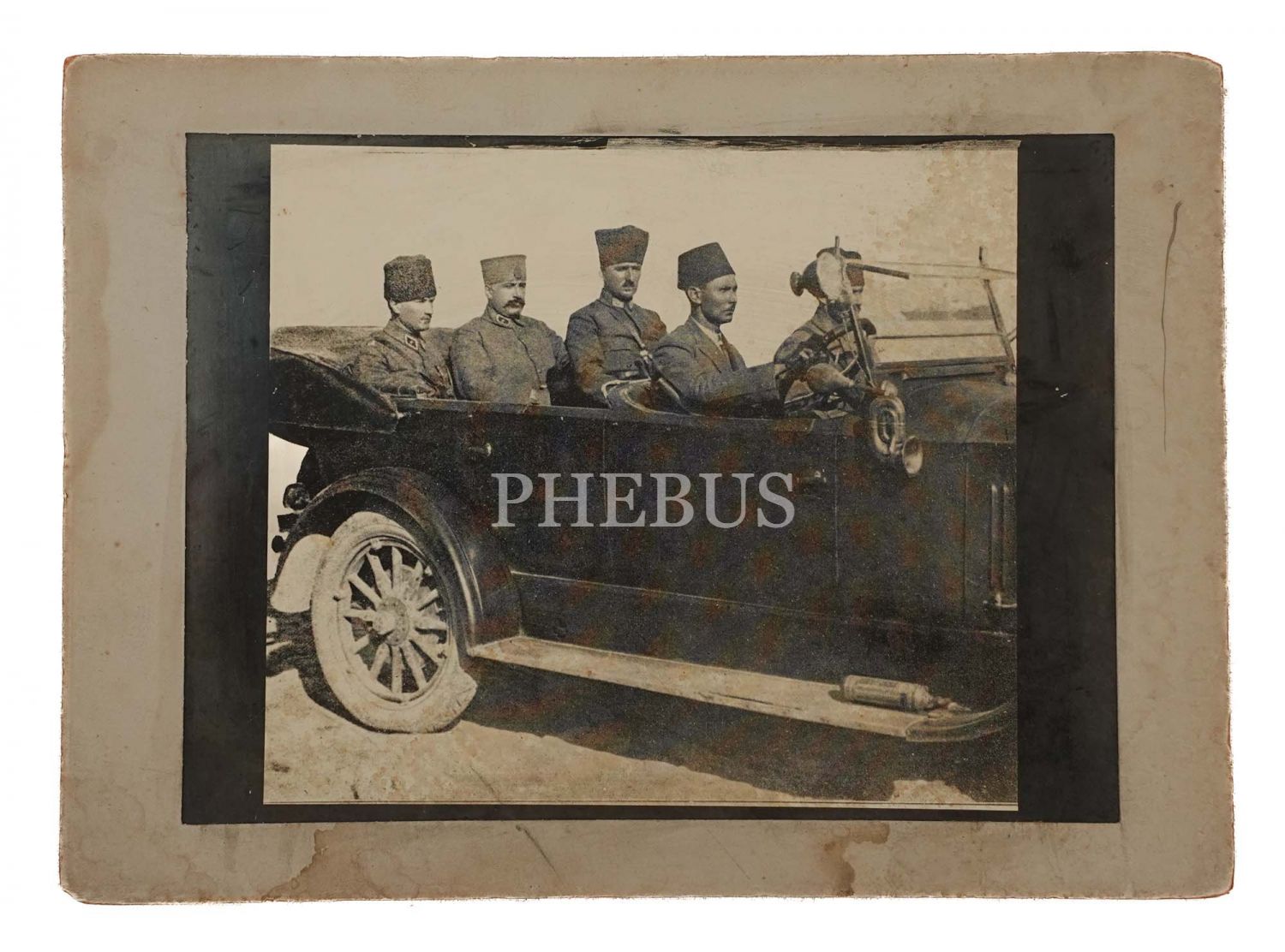 Mustafa Kemal Atatürk, çıkmış olduğu bir yurt gezisinde kendisini şehir dışında karşılamaya gelen askeri ve sivil erkanla selamlaşırken, 9x6 cm...