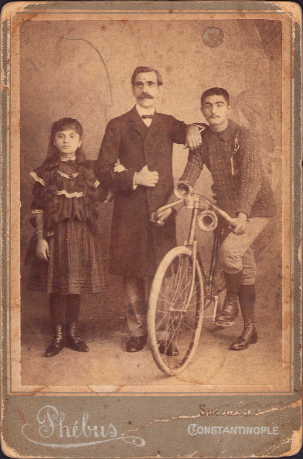 Osmanlı dönemi, Bisikletli çocuk ve ailesi kabin fotoğrafı, Phebus Fotoğrafhanesi, 12x18 cm.