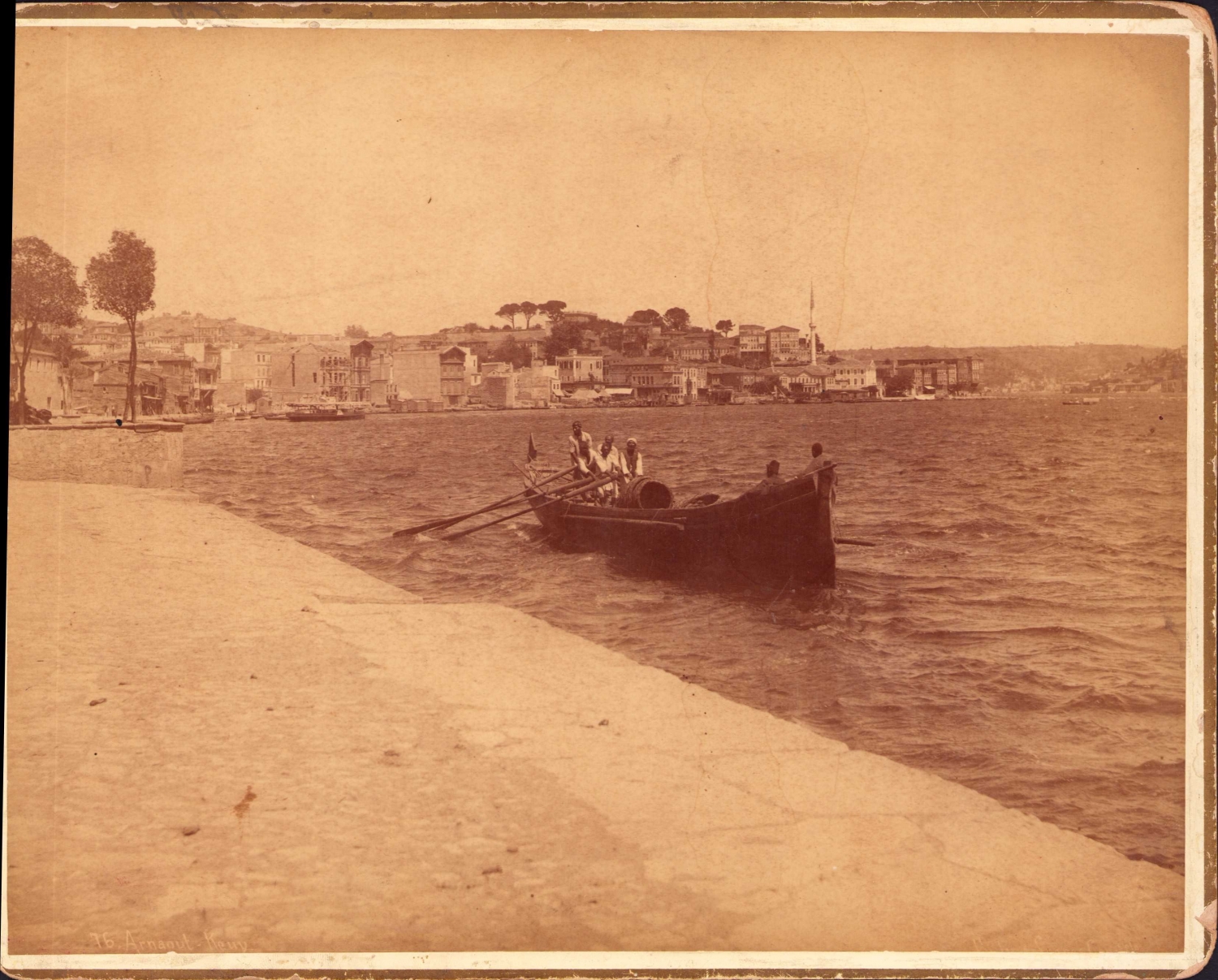 Osmanlı dönemi sepya fotoğraf, İstanbul Boğazı, Kayıkçılar ve Yalılar, 28,5x22,5 cm.