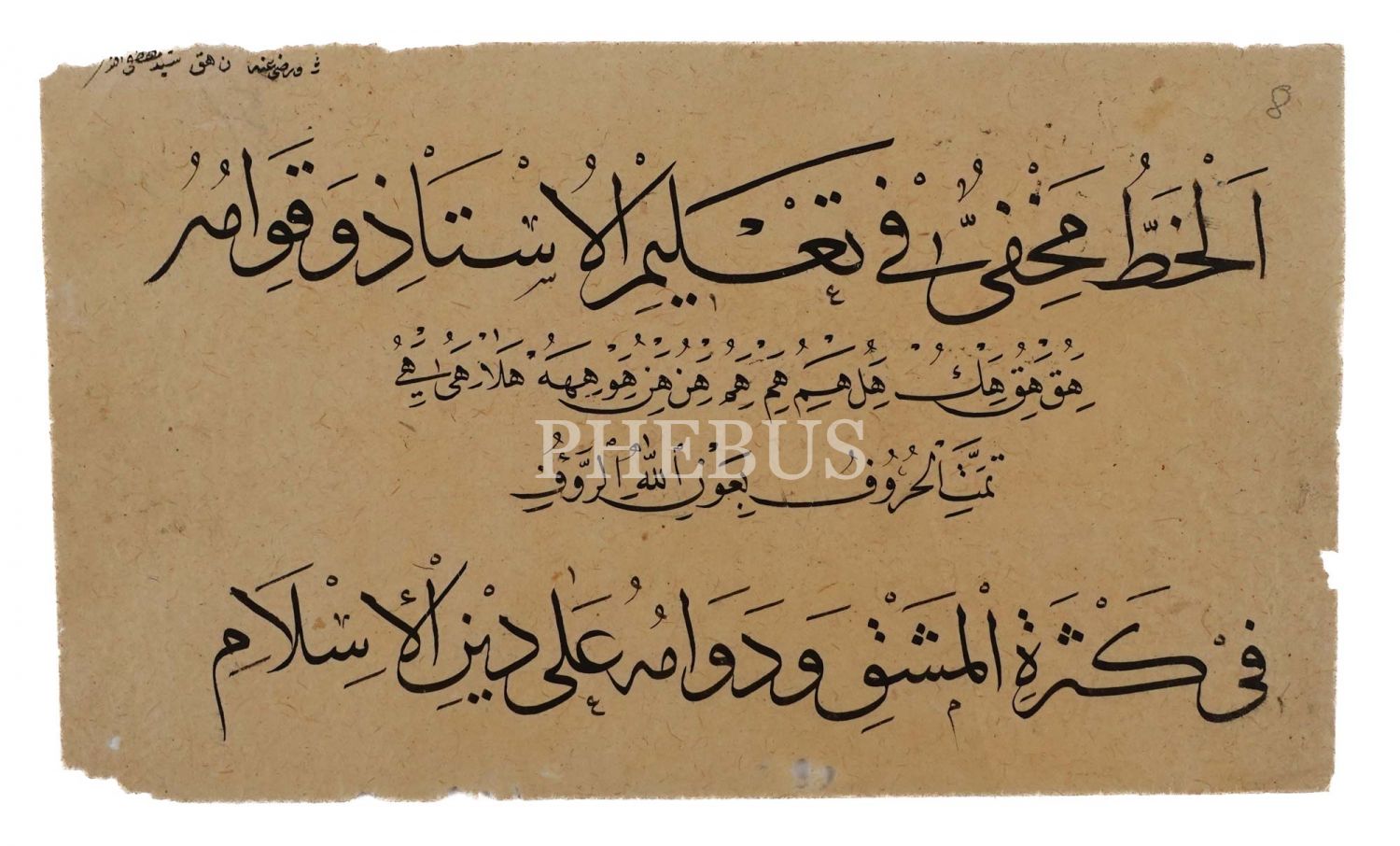 Nesih yazıda temmet sayfası ve sülüs yazıda hüsn-i hat ile alakalı vecizelerin yazılı olduğu sayfa, sol üstte Seyyid Mustafa Efendi´ye verildiğine dair kayıt mevcut.
