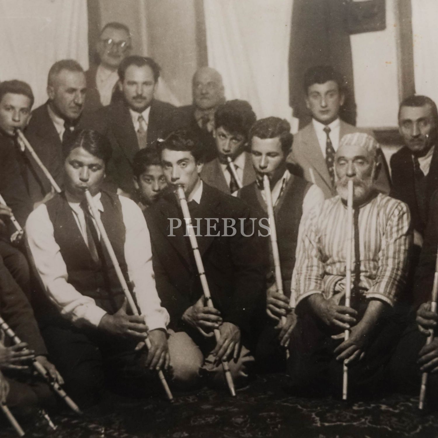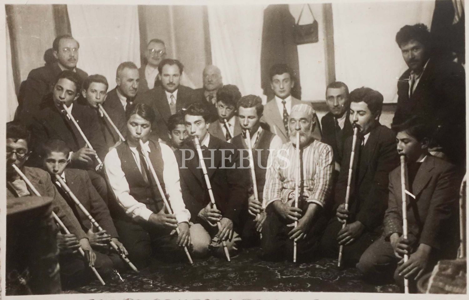 Kütahya'da bir mecliste Ressam Ahmet Yakuboğlu ve ney üfleyen müzisyenler, 13x8 cm...