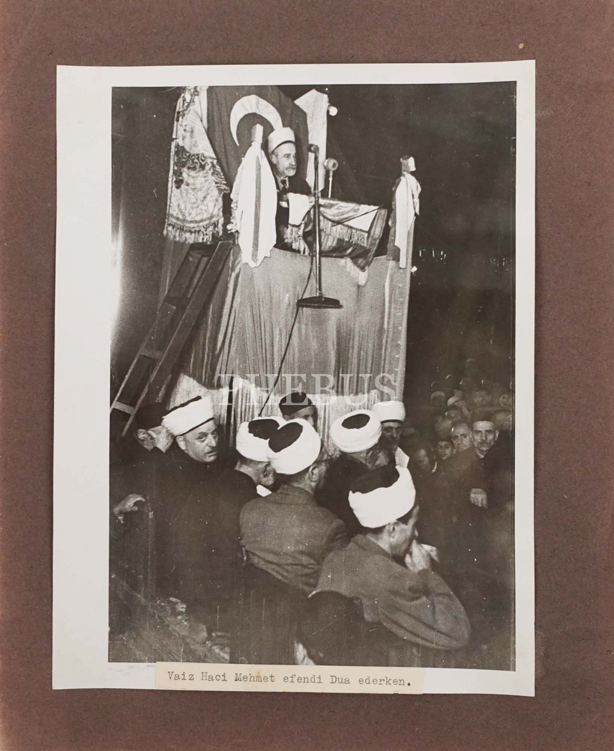 1950 yılında Kore Şehitleri için Süleymaniye Camii'nde yapılan mevlid programından bir fotoğraf, kürsünün alt köşesinde dönemin diyanet reisi Aksekili Ahmed Hamdi Efendi görünüyor, paspartu ölçü: 29x24 cm...