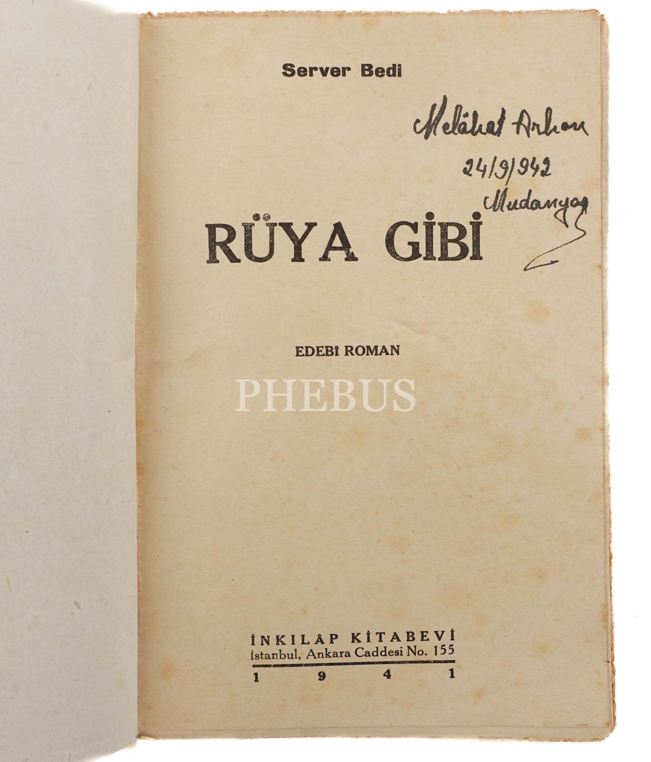 RÜYA GİBİ, Server Bedi (Peyami Safa), 1941, İnkılap Kitabevi, 112 sayfa, 13x19 cm...