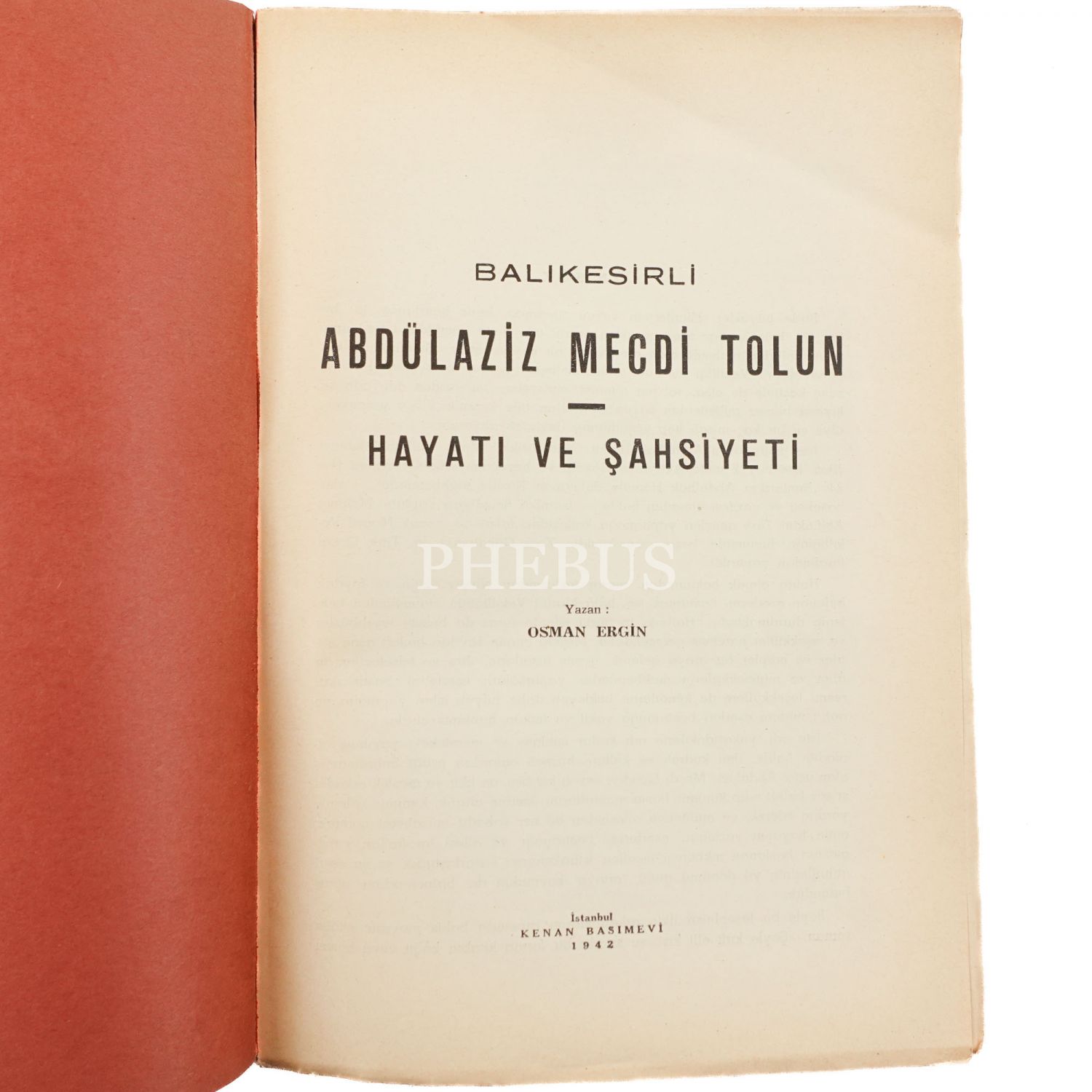 BALIKESİRLİ ABDÜLAZİZ MECDİ TOLUN HAYATI VE ŞAHSİYETİ, Osman Ergin, 1942, Kenan Basımevi, 340 sayfa, 18x26 cm...