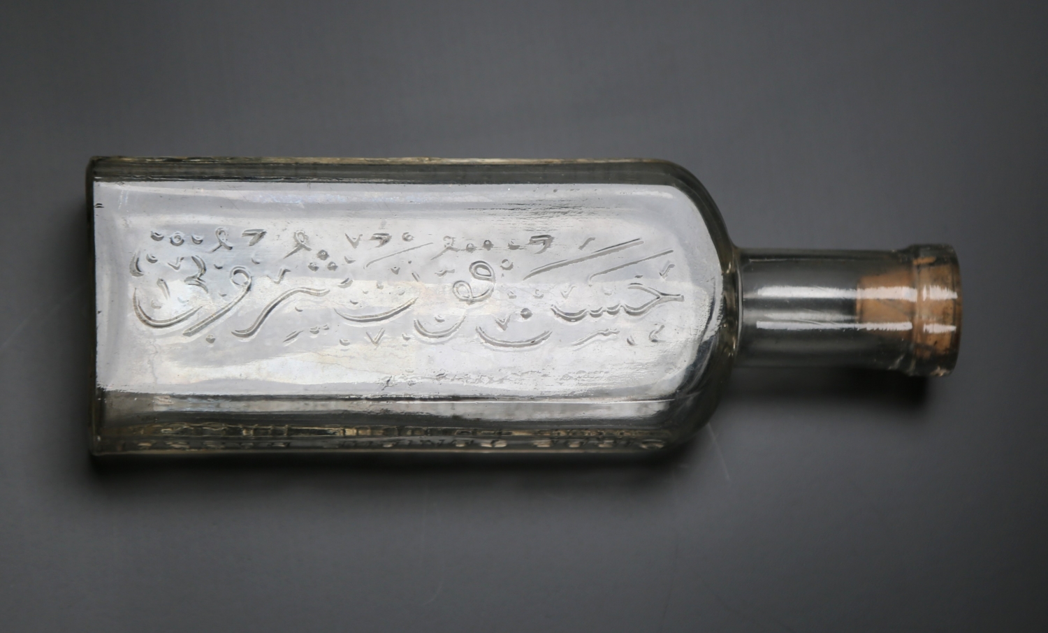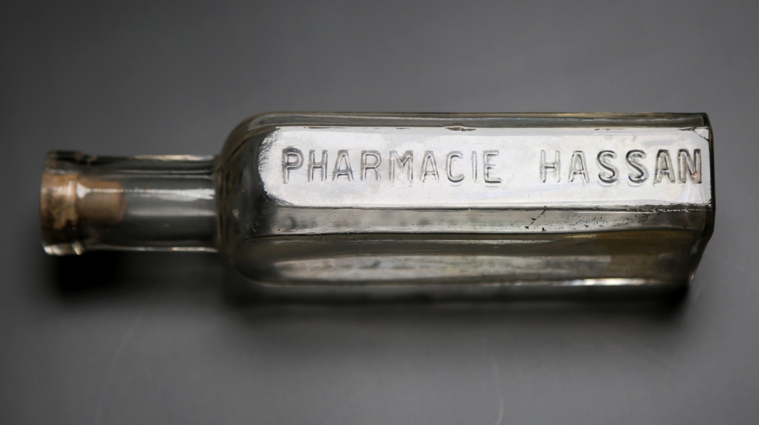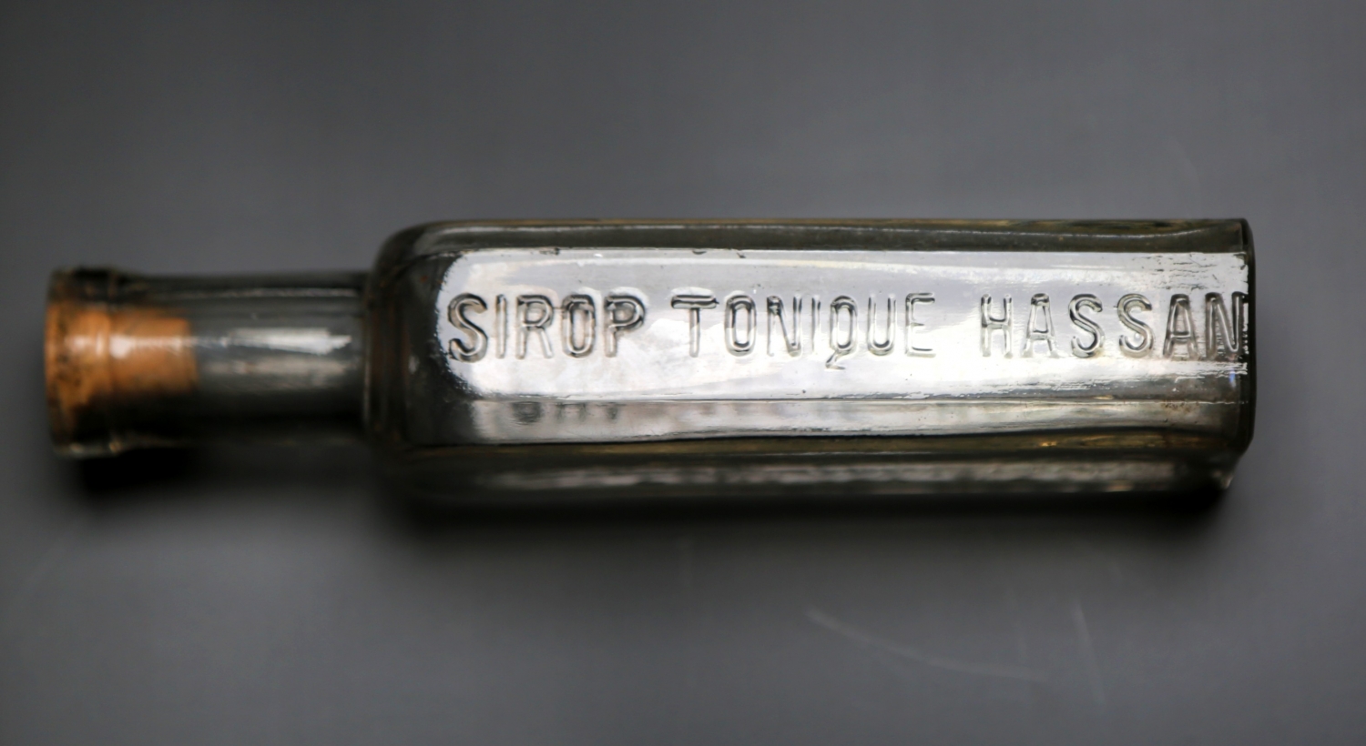 Üzerinde 'Sırop Tonique Hassan' ve 'Pharmacie Hassan' yazılı ve kabartmalı şurup şişesi, 5,5x3x16 cm.