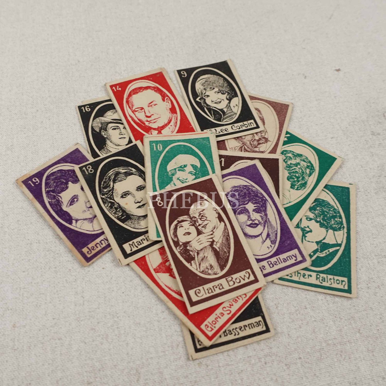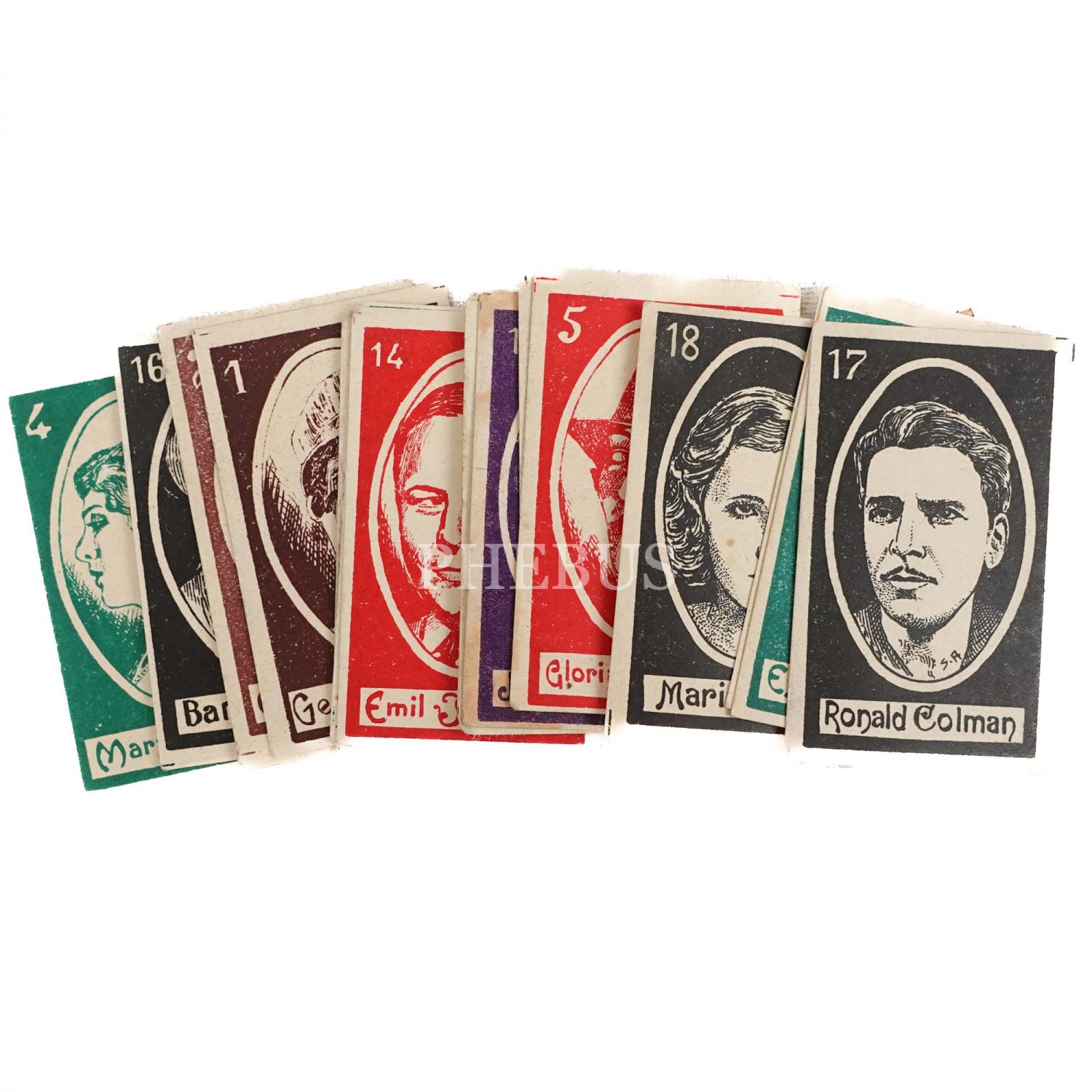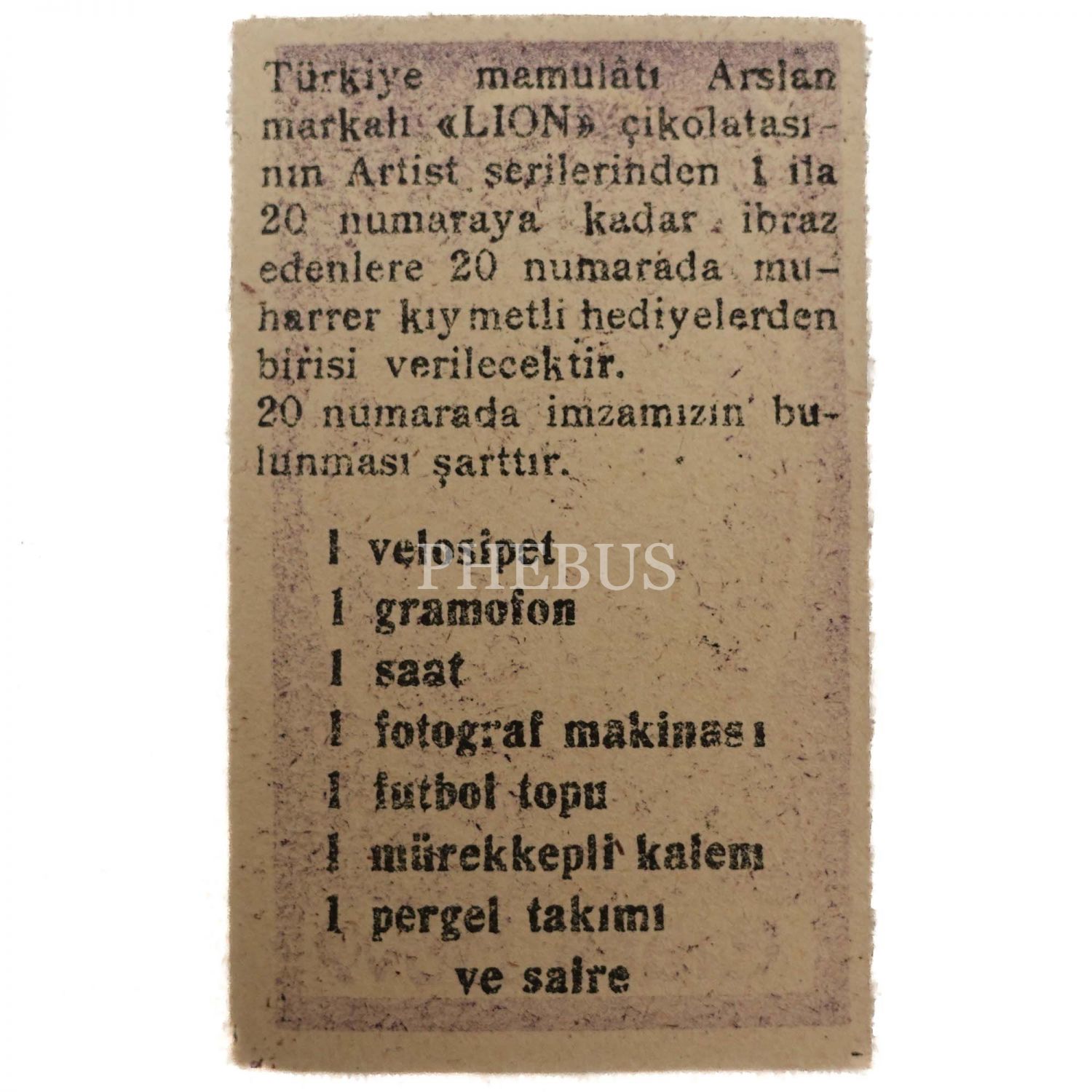 1-11 ile 14-19. kartlar sıralıdır. 12. ve 13. kart eksiktir. Kartların arka yüzünde yer alan yazı: "Türkiye mamulâtı Arslan markalı ´LION´ çikolatasının Artist serilerinden 1 ila 20 numaraya kadar ibraz edenlere 20 numarada muharrer kıymetli hediyelerden birisi verilecektir. 20 numarada imzamızın bulunması şarttır. 1 velosipet, 1 gramofon, 1 saat, 1 fotograf makinası, 1 futbol topu, 1 mürekkepli kalem, 1 pergel takımı ve saire."