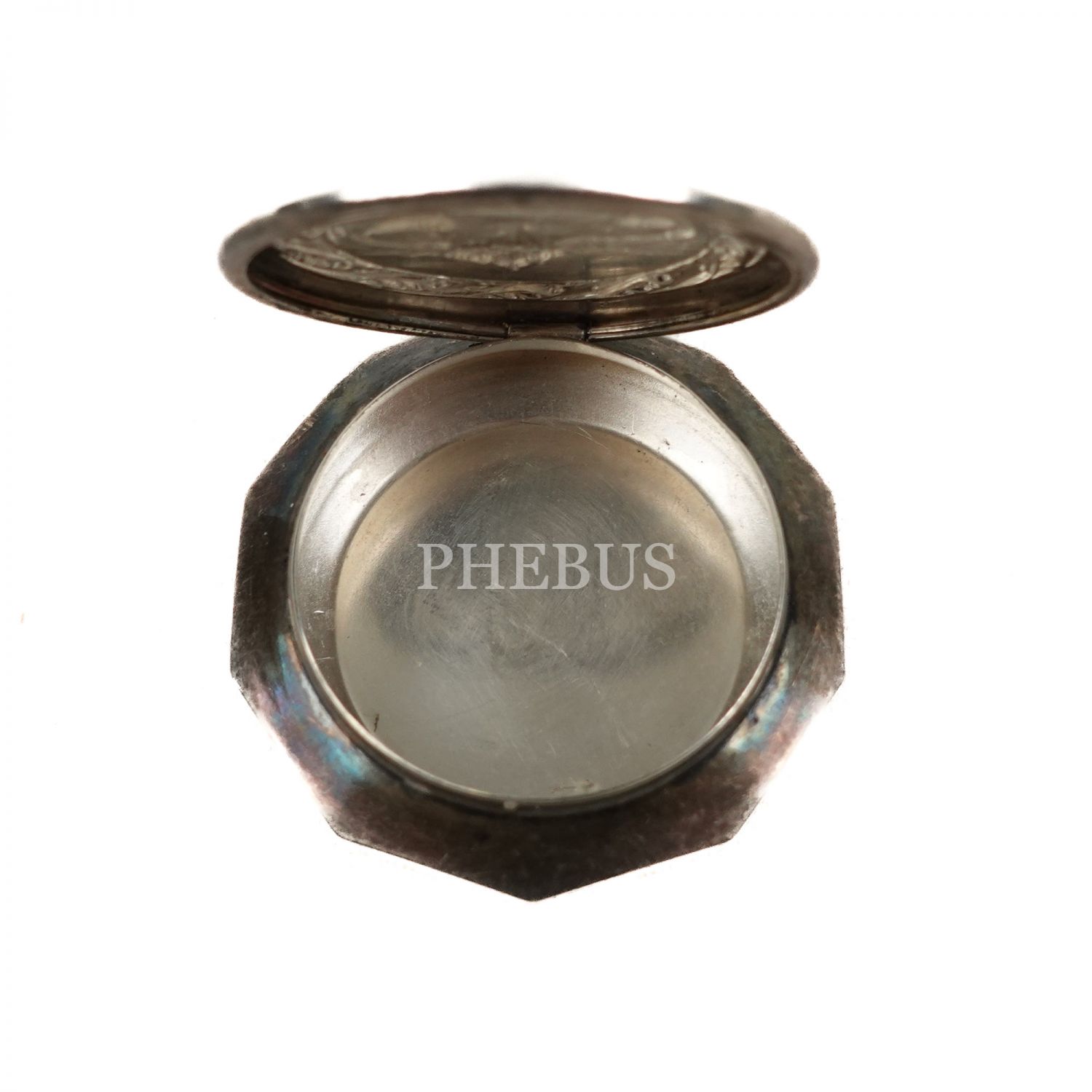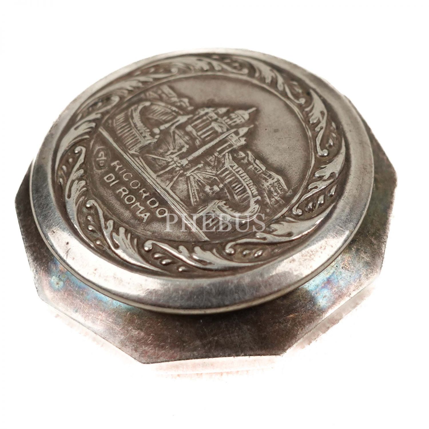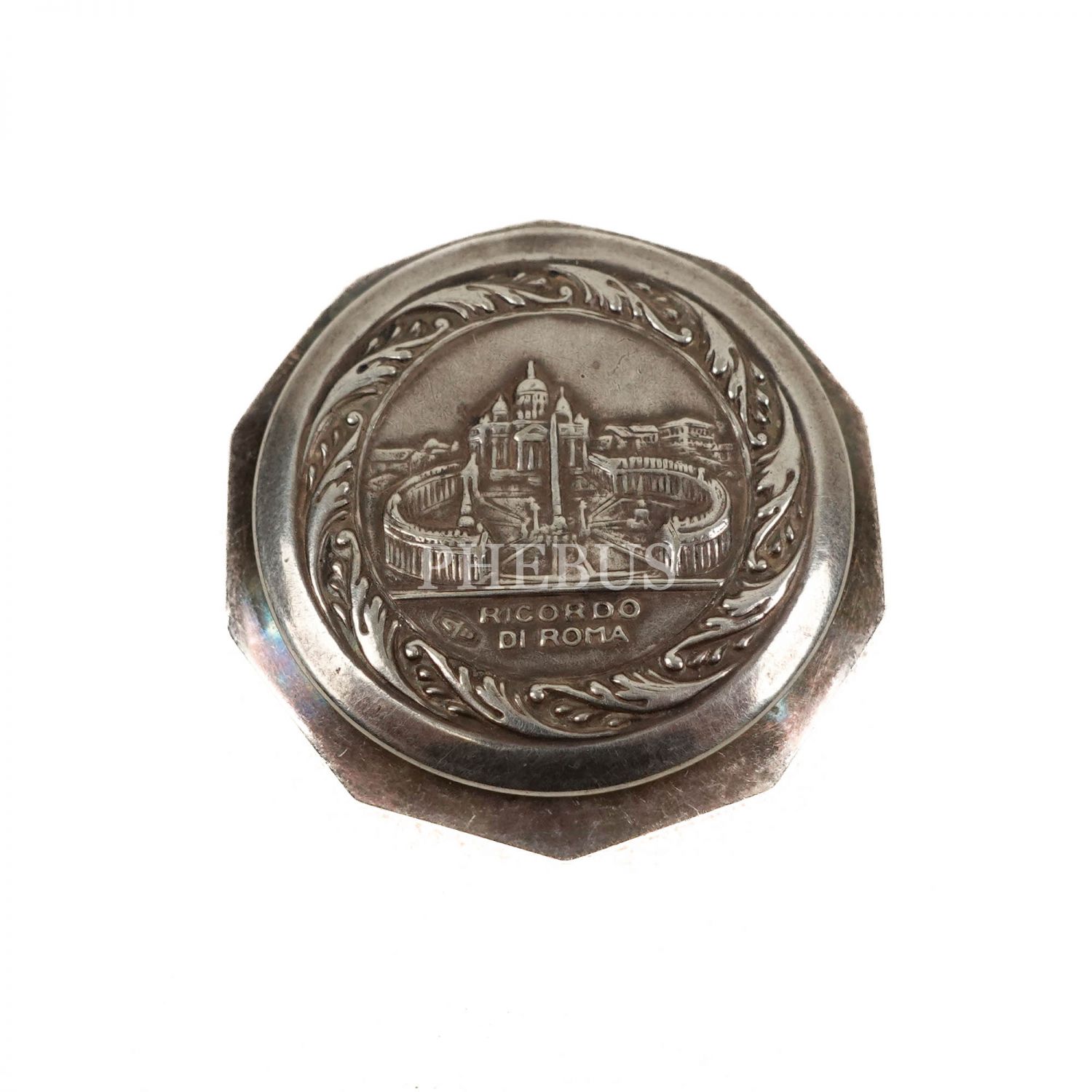 Kapağı "Ricordo di Roma" (Roma Hatırası) ibareli ve Roma şehri silüetli gümüş kutu, 4,5x1 cm...