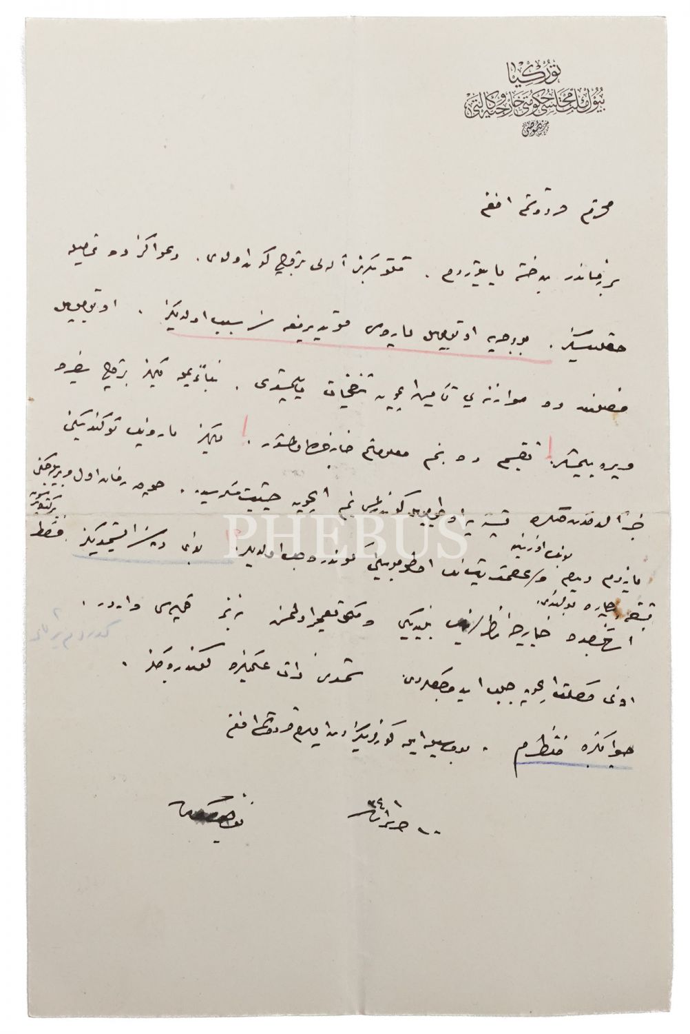 Türkiye Dışişleri Bakanlığı müsteşarlarından Tevfik Kamil Koperler´in, Budapeşte Elçisi Hüsrev Gerede´ye gönderdiği "Türkiye Büyük Millet Meclisi Hariciye Vekaleti Hususi" antetli kağıt üzerine kaleme aldığı ıslak imzalı mektup, 10 Haziran 1341 (1925), 16x25 cm...