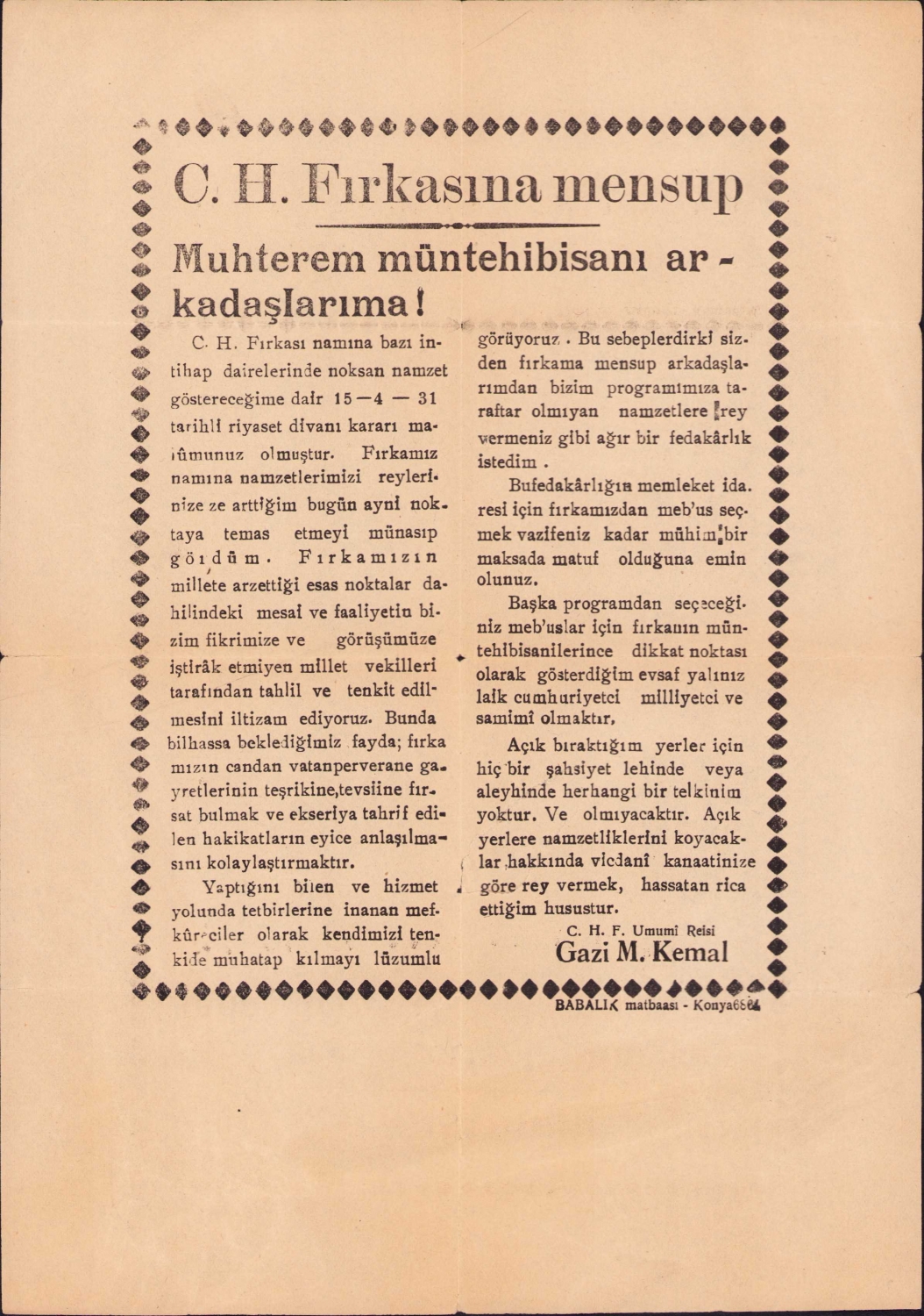 Mustafa Kemal Atatürk tarafından Cumhuriyet Halk Fırkası'na mensup müntehib-i sanilere hitaben yazılmış matbu mektup, Babalık Matbaası, 1931 tarihli, 20,5x28 cm.