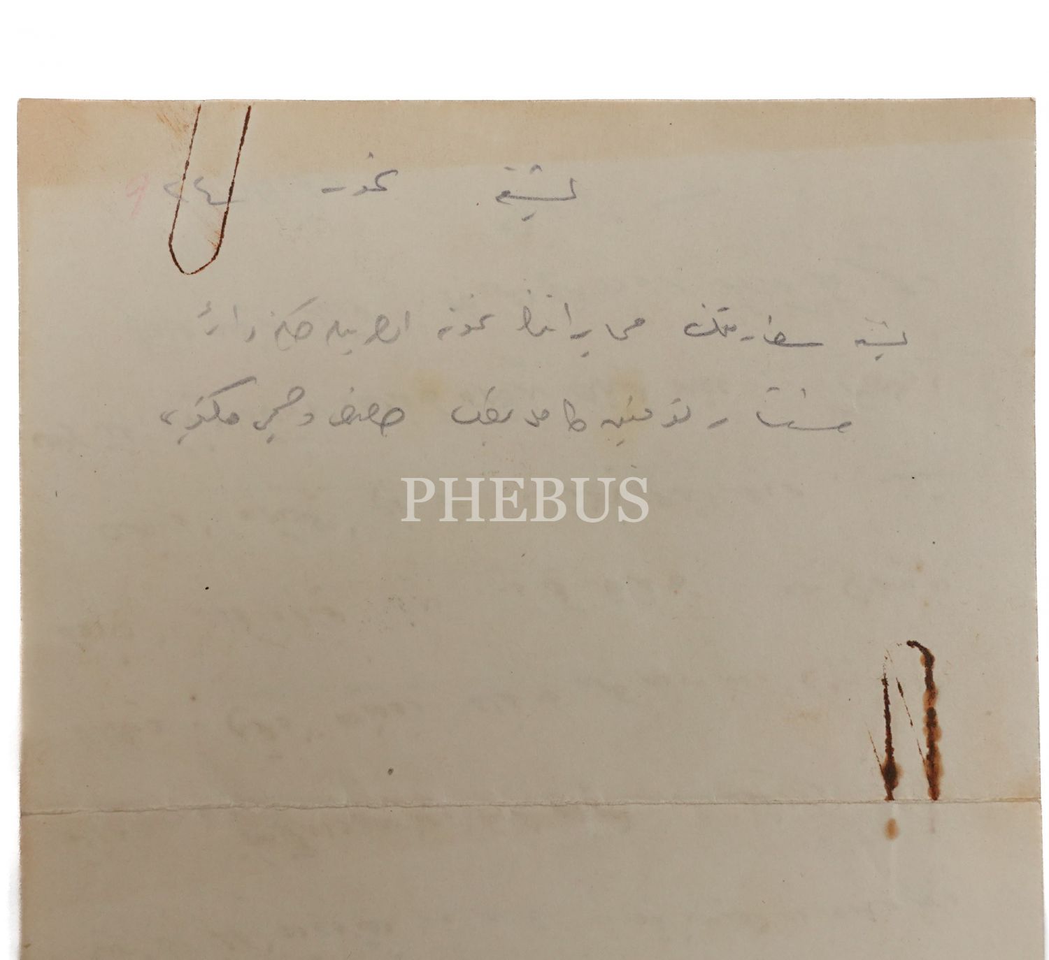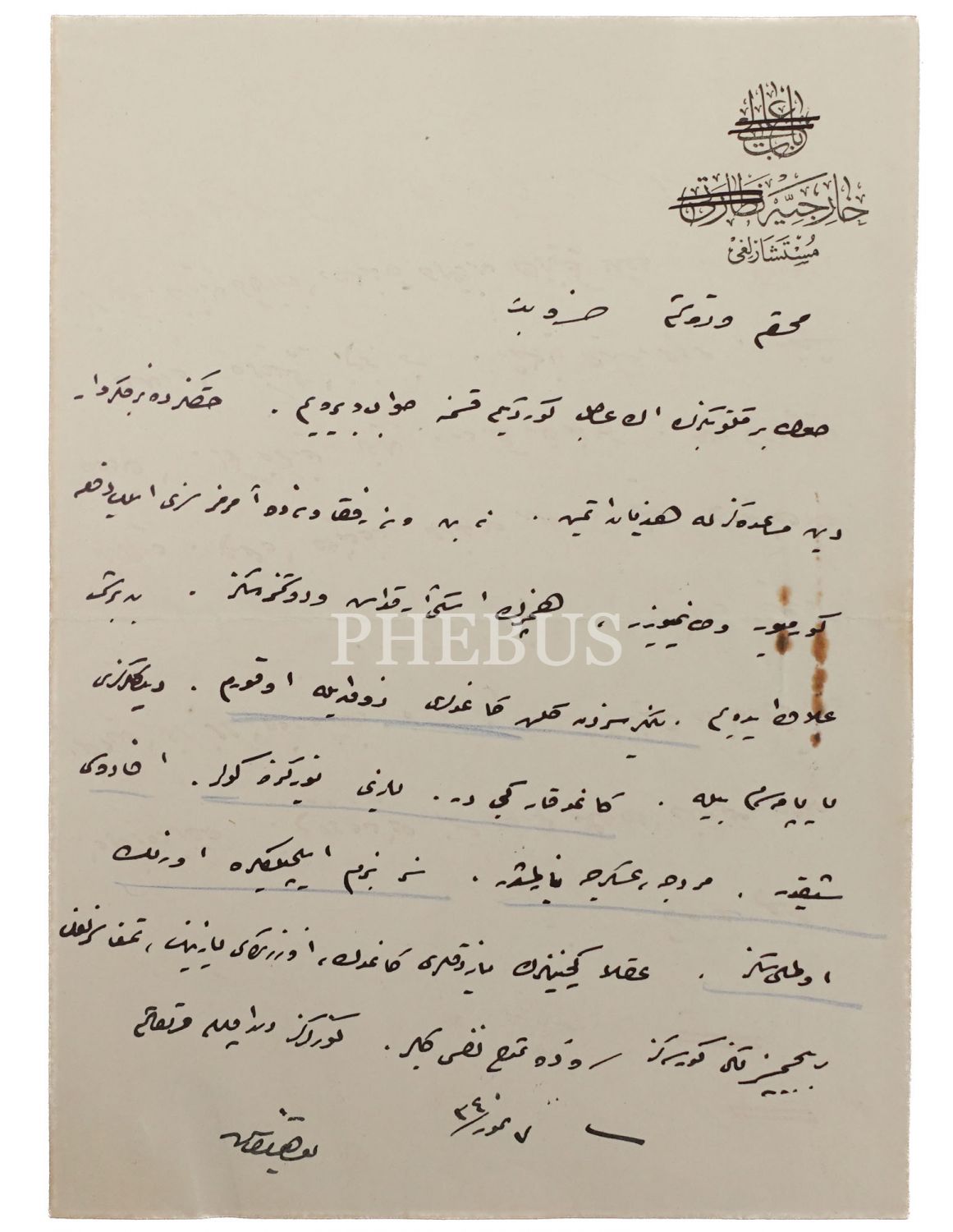 Türkiye Dışişleri Bakanlığı müsteşarlarından Tevfik Kamil Koperler´in, "Bab-ı Ali Hariciye Nezareti Müsteşarlığı" antetli ancak "Bab-ı Ali" ve "Hariciye" bölümlerinin üstü çizilmiş kağıt üzerine kaleme alıp Budapeşte Elçisi Hüsrev Gerede´ye gönderdiği ıslak imzalı mektup, 7 Temmuz 1341 (1925), 14x20 cm...