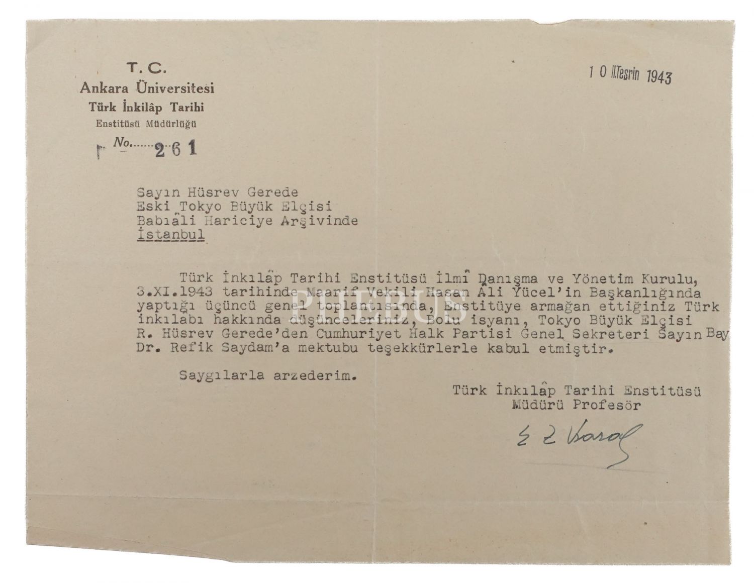 "Türk İnkılâp Tarihi Enstitüsü Müdürü Profesör" Enver Ziya Karal tarafından Hüsrev Gerede´ye gönderilmiş, Hüsrev Bey´in CHP Genel Sekreteri Refik Saydam´a gönderdiği Türk inkılabı hakkındaki düşüncelerini ihtiva eden mektubun ulaştırıldığını ve kabul edildiğini bildiren mektup, 10 İkinciteşrin 1943, 21x16 cm...