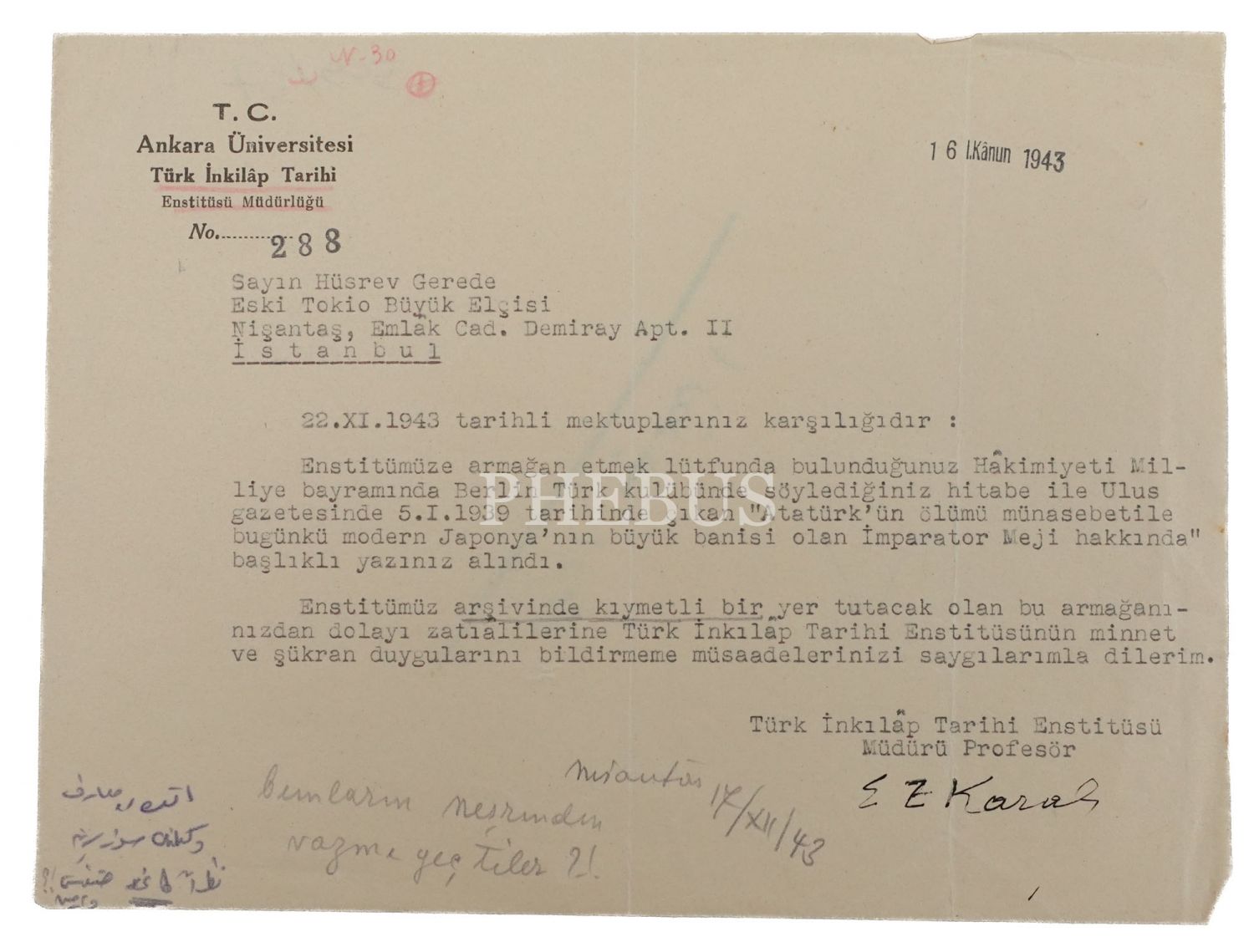 "Türk İnkılâp Tarihi Enstitüsü Müdürü Profesör" Enver Ziya Karal tarafından Hüsrev Gerede´ye gönderilmiş, Hüsrev Bey´in Berlin Türk Kulübü´nde yaptığı konuşma ile Ulus gazetesinde yayımlanan "Atatürk´ün ölümü münasebetile bugünkü modern Japonya´nın büyük banisi olan İmparator Meji hakkında" başlıklı yazısının Türk İnkılâp Tarihi Enstitüsü´ne ulaştığını bildiren ve bunları ulaştırdığı için teşekkür sunan mektubu, 16 Birincikanun 1943, 21x16 cm...