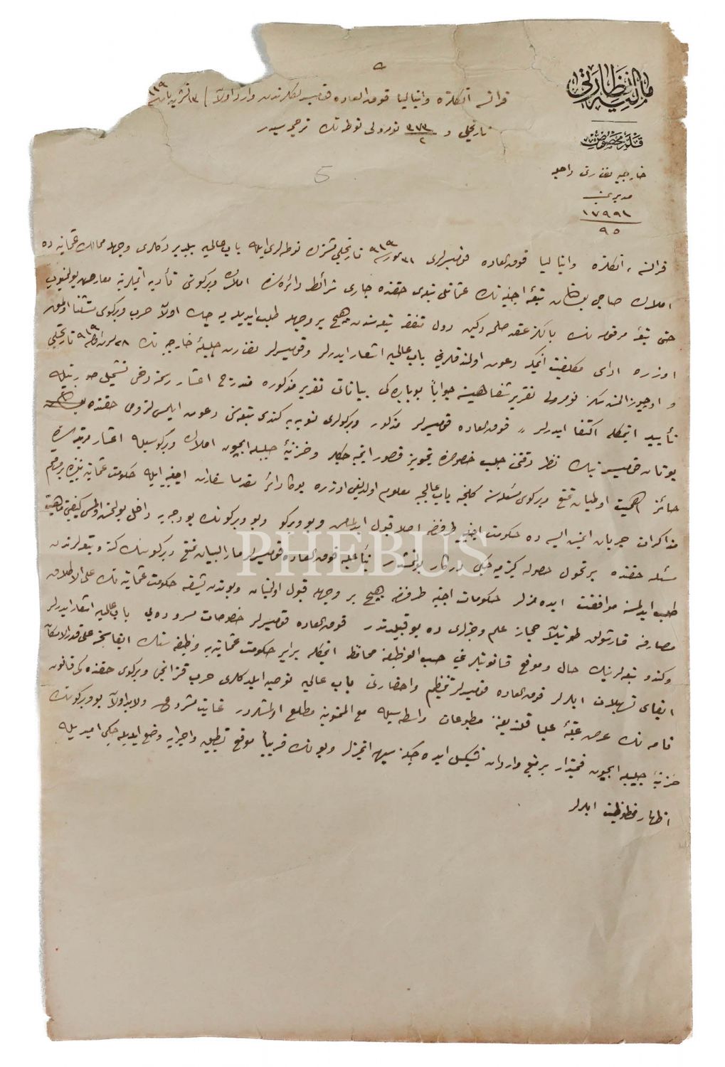 Fransa, İngiltere ve İtalya Fevkalade Komiserliği tarafından Maliye Nezareti´ne gönderilmiş, Osmanlı´da ikamet etmekte olan Yunan ve İtilaf Devletleri´nin vatandaşlarından emlak ve savaş vergisi alınmayacağı husunda kaleme alınmış notanın tercümesi, 21x33 cm...