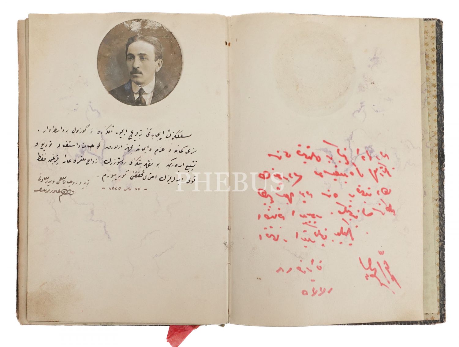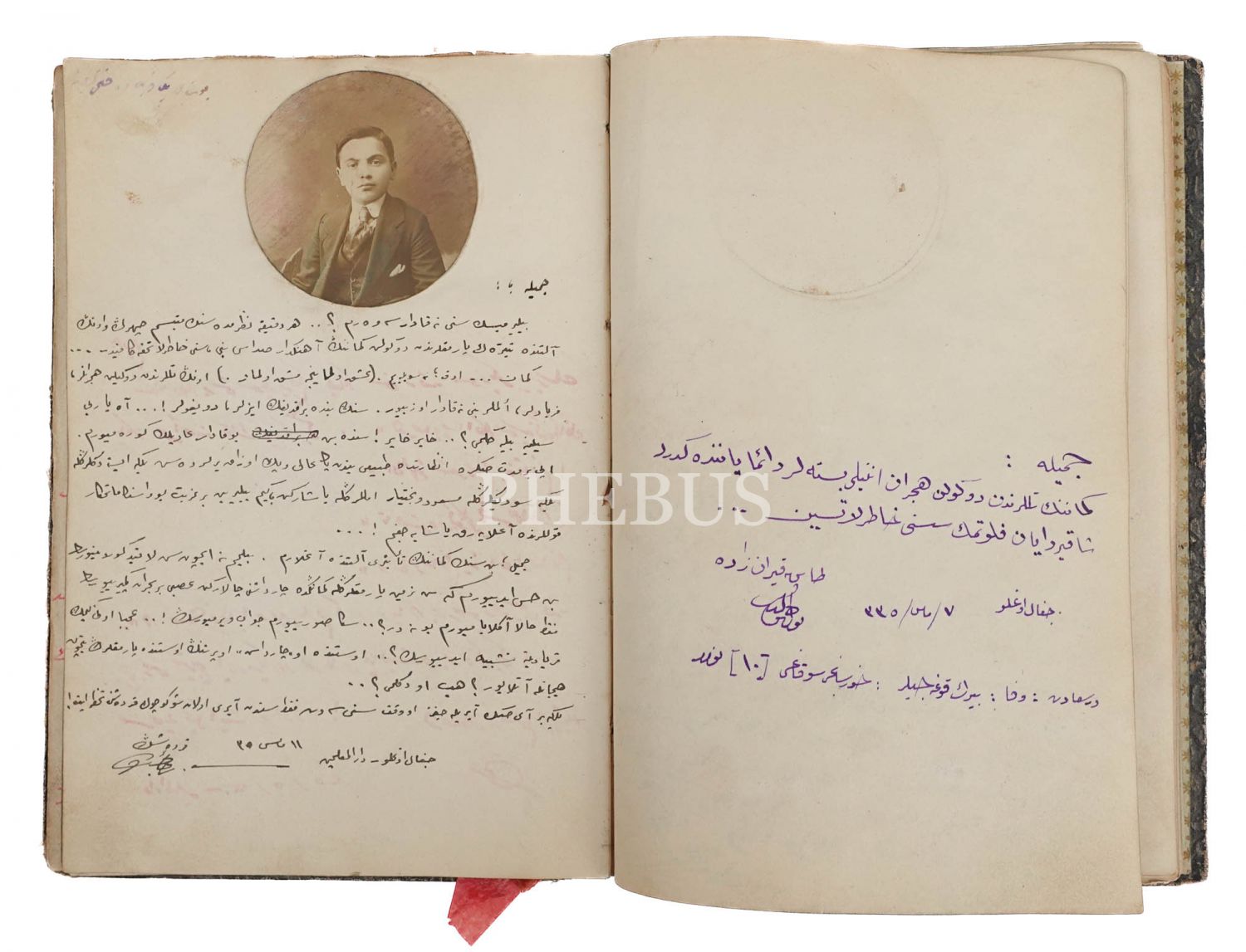 İstanbul Dârülmuallimîn-i Âliye´de eğitim gören bir beyefendinin, aralarında İbrahim Alaaettin Gövsa´nında bulunduğu okulun yönetim kadrosunun, öğretmenlerinin ve öğrenci arkadaşlarının hatıralarını kaleme alıp imzaladığı defteri, 14x20 cm...
