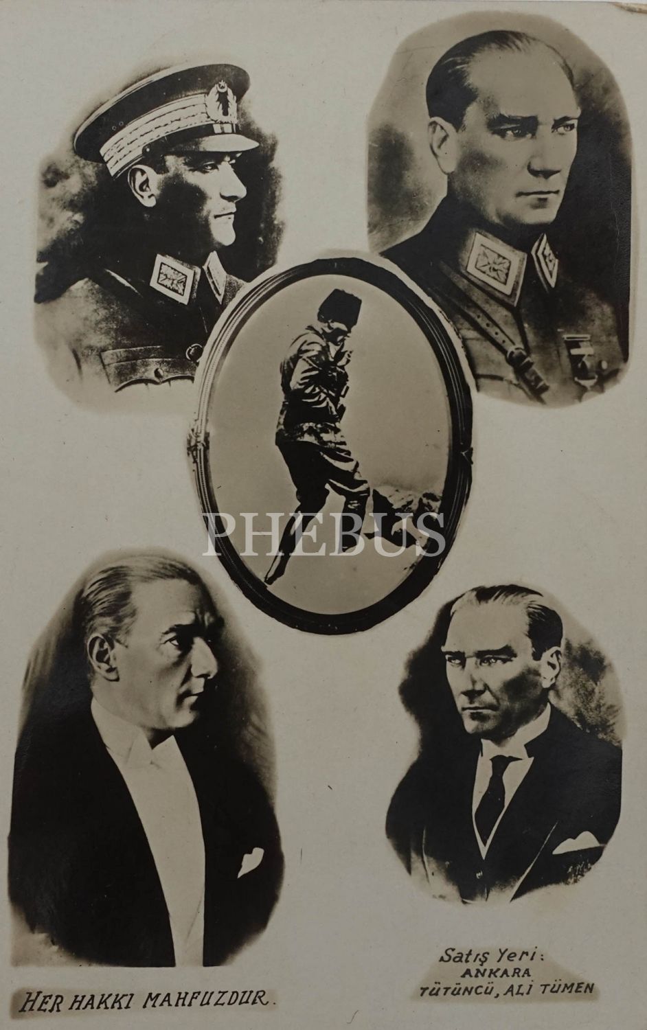 Mustafa Kemal Atatürk´ün çeşitli fotoğraflarından meydana gelen kartpostal, ed: Tütüncü, Ali Tümen (Ankara), 14x9 cm...
