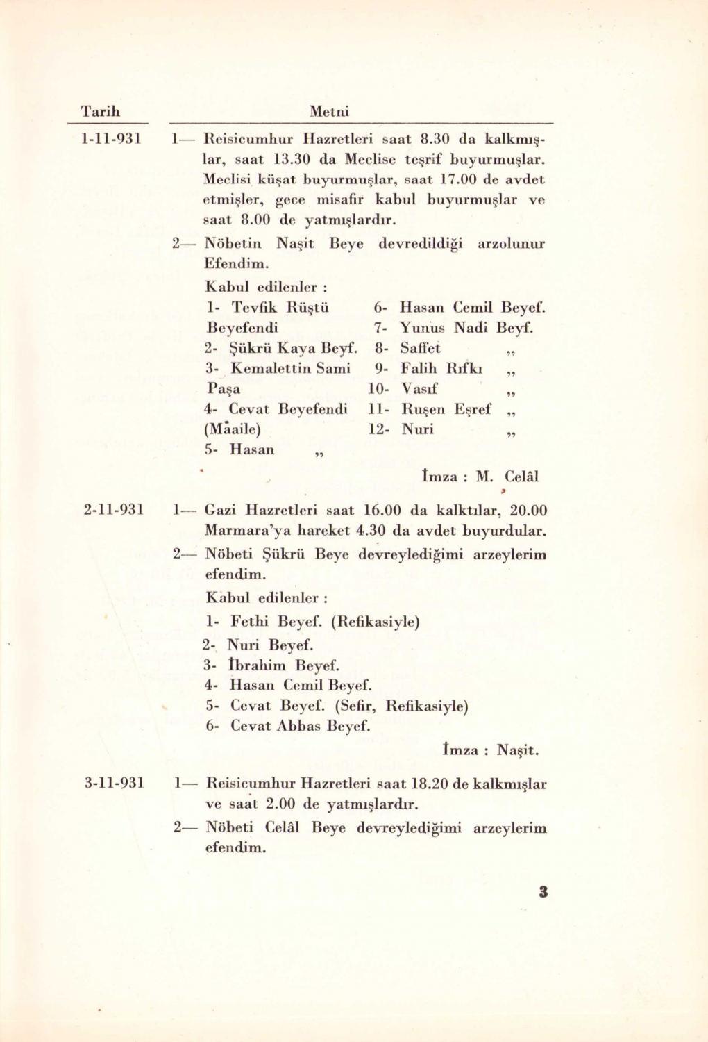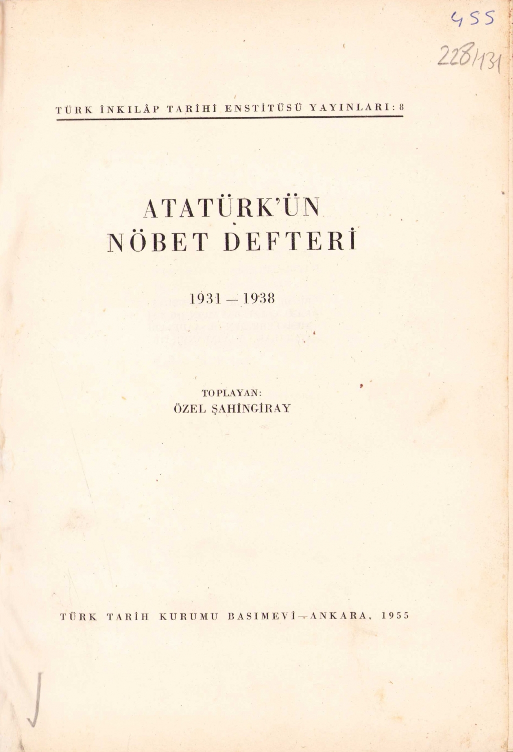 Atatürk'ün Nöbet Defteri 1931-1938, Toplayan Özel Şahingiray, Türk İnkılap Tarihi Enstitüsü Yayınları, Türk Tarih Kurumu Basımevi, Ankara, 1955, 750 sayfa, 17x24 cm.