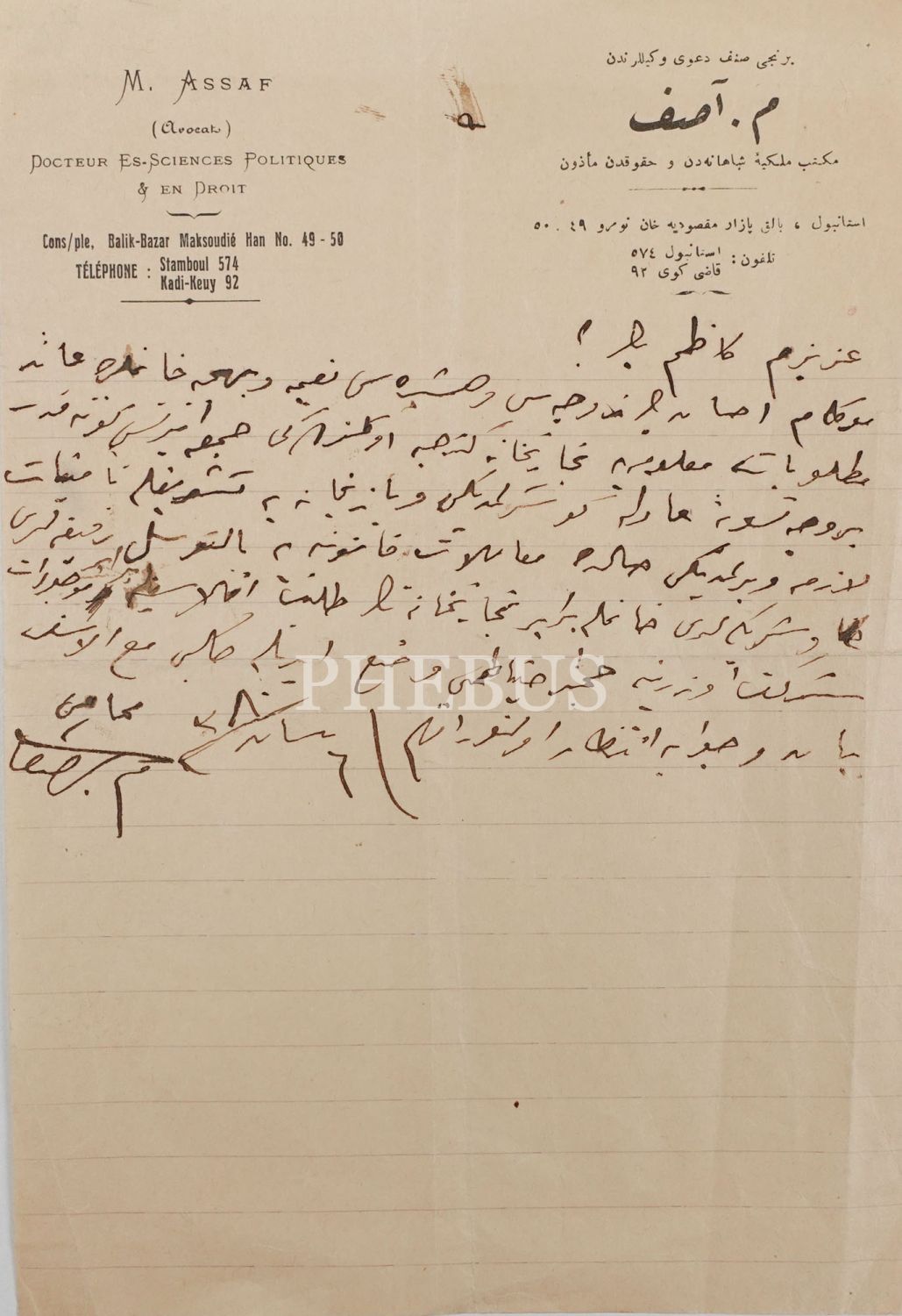 "Birinci Sınıf Davavekillerinden M. Asaf - Mekteb-i Mülkiye-i Şahane´den ve Hukuk´tan mezun" antetli kağıt üzerine kaleme alınmış, Avukat M. Asaf Bey´in dava hakkında kaleme aldığı mektup, 15x21 cm...