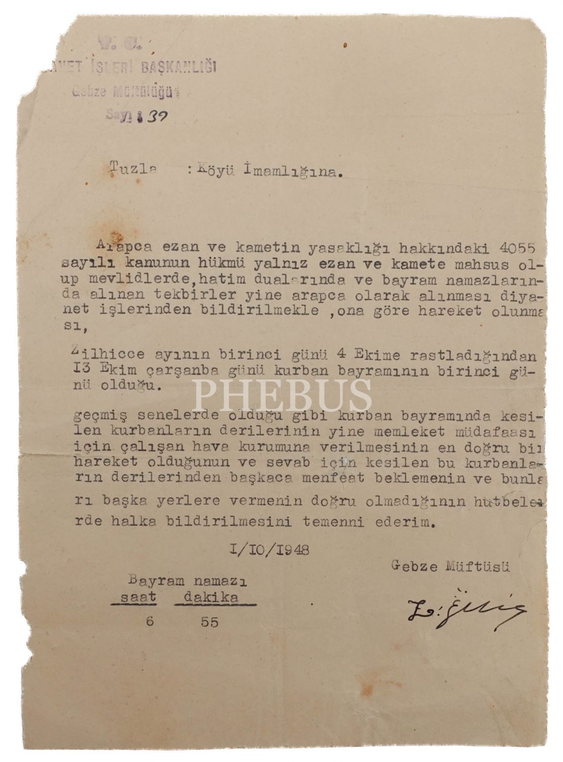Gebze Müftülüğü´nden Tuzla İmamlığı´na gönderilen, yalnızca ezan ve kametin Arapça olarak okunmasının yasak olduğu ibadetler esnasında okunacak dua ve tekbirlerin Arapça olarak okunmasında bir mahsur olmadığını ve Kurban Bayramı´nda kesilen kurbanların derilerinin Tük Hava Kurumu´na bağışlanması gerektiğini bildirir evrak, 1 Ekim 1948, 15x21 cm...