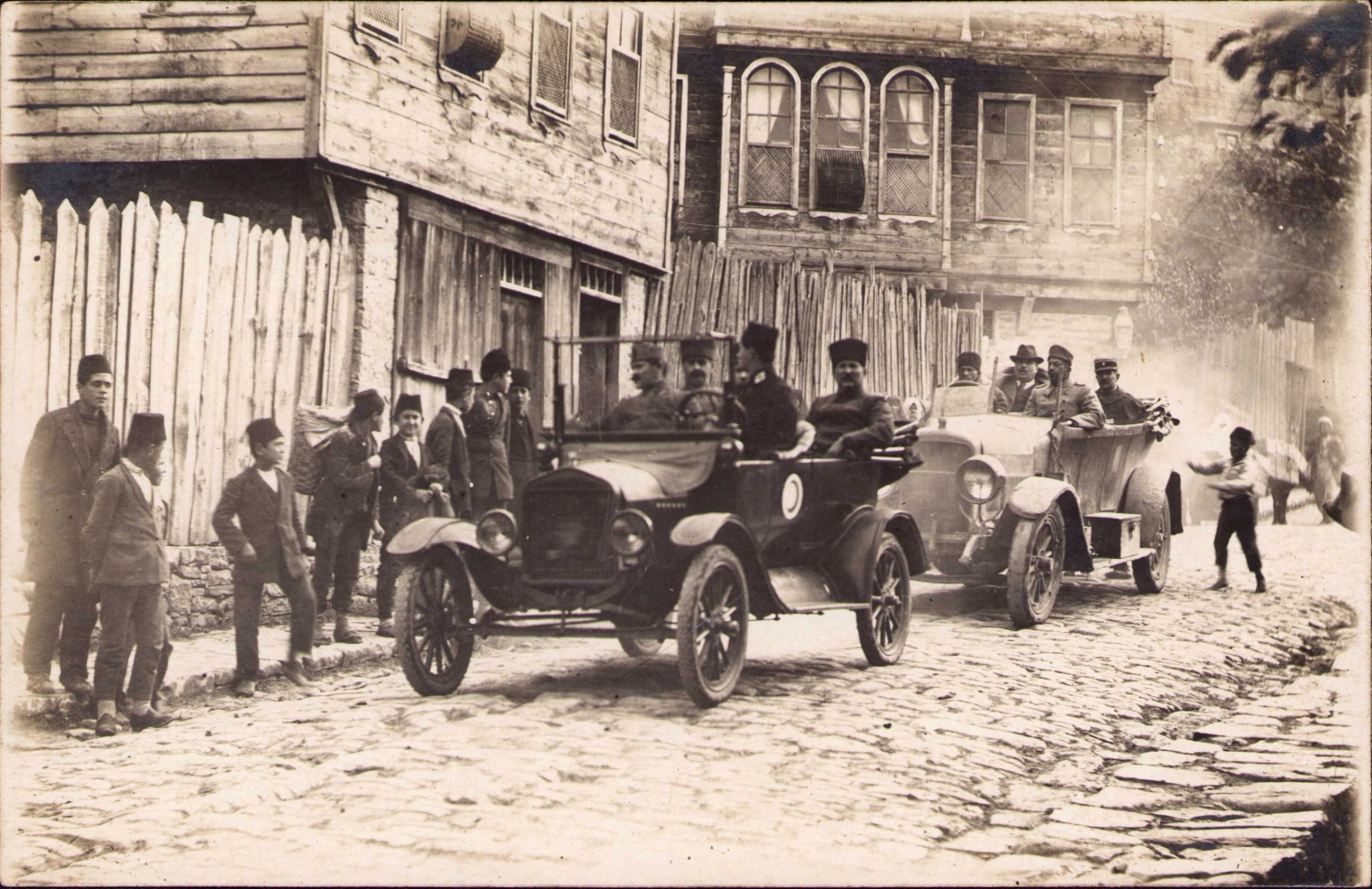 Osmanlı Hilal-i Ahmer Cemiyeti amblemli araba ve askerler, 14x9 cm.