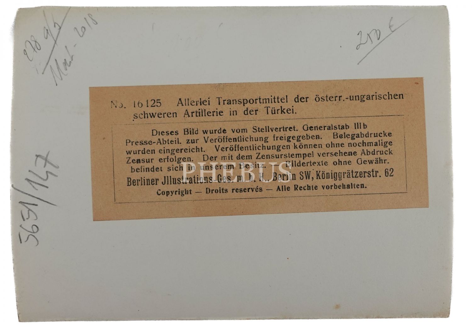 Arka yüzünde daktiloyla yazılmış Almanca açıklama bandı mevcuttur.
