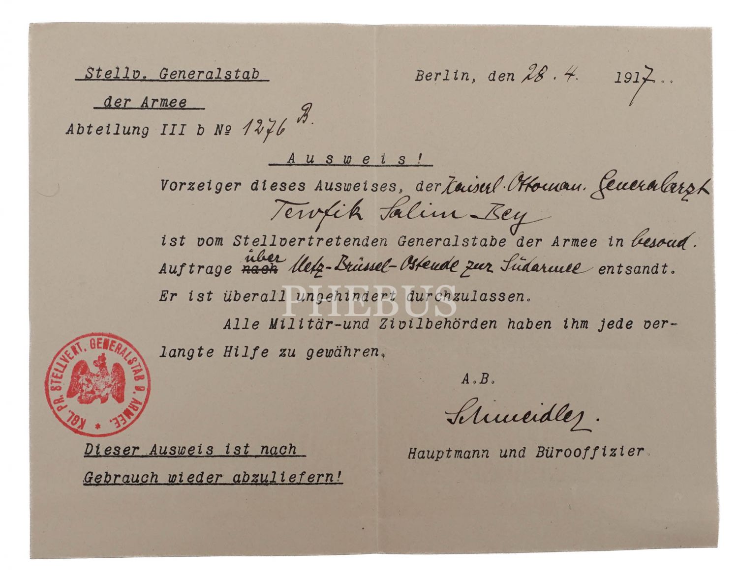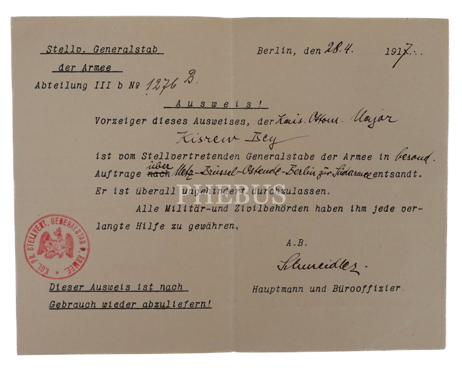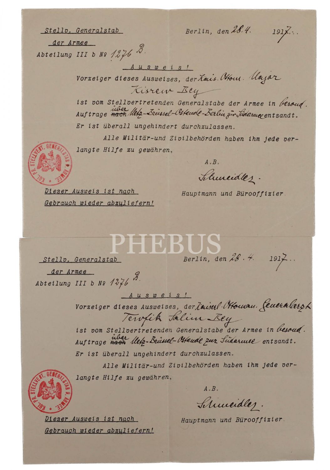 Alman Genelkurmayı tarafından Hüsrev Gerede ile Tevfik Salim Bey adına 28 Nisan 1917´de düzenlenmiş engelsiz geçiş pasaportları, 21x17 cm...