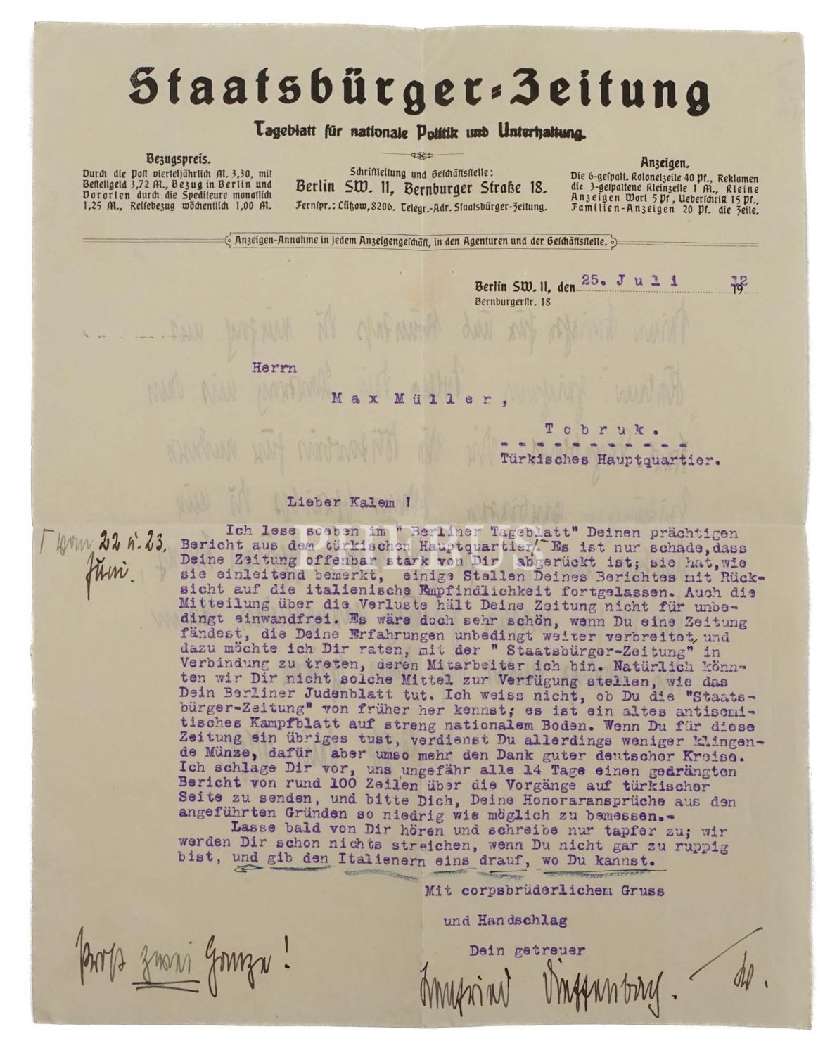 Alman filolog ve oryantalist Max Müller´ in Libya Tobruk'tan bir Türk gazeteciye gönderdiği, Almanca "Vatandaş Gazetesi" (Staatsbürger-Zeitung) antetli daktilo propaganda mektubu, 1912, zarf 16x13 cm, mektup 22x29 cm...