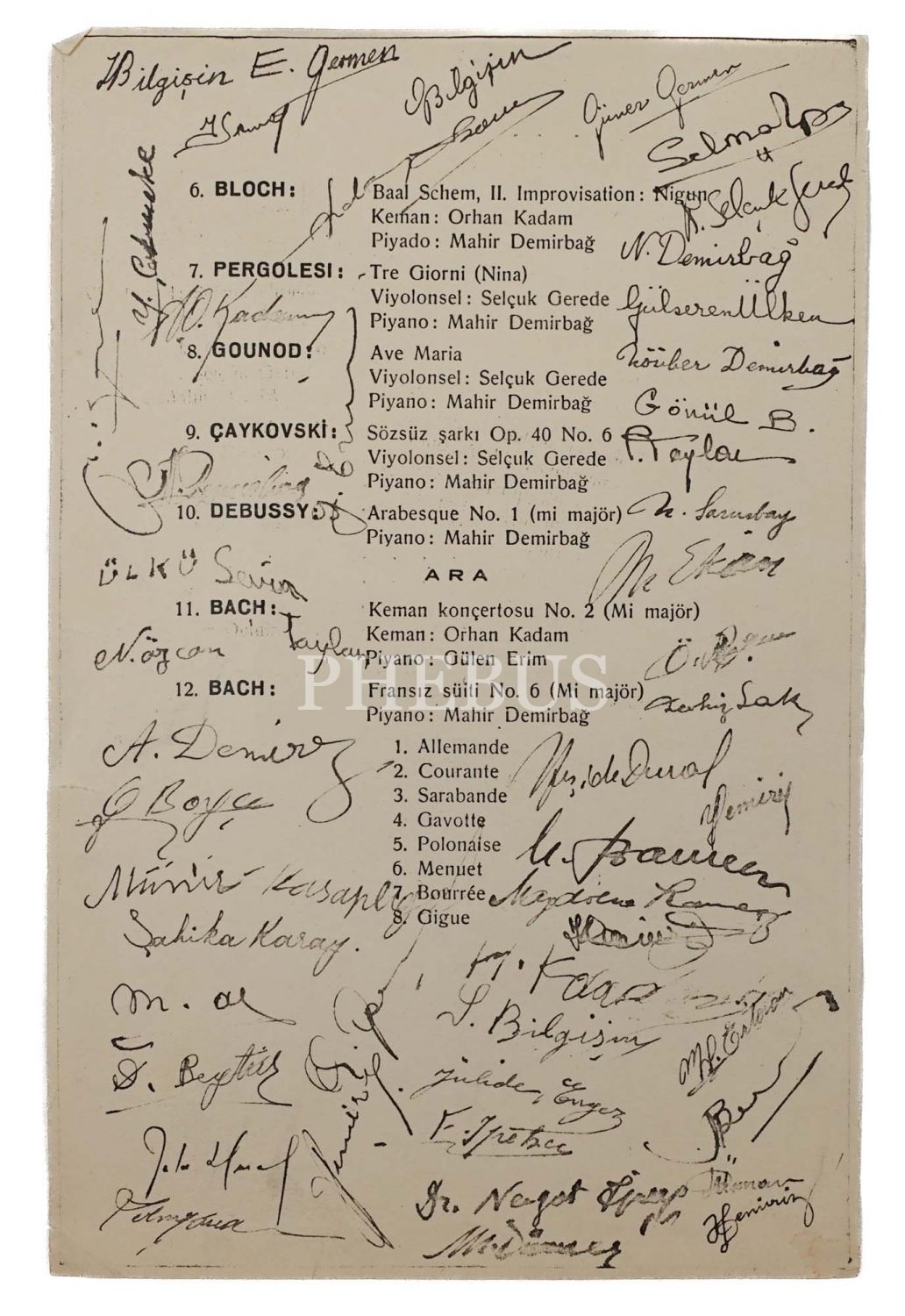 Bach, Debussy, Çaykovski, Gounod, Pergolesi ve Bloch eserlerinin çaldığı bir konser akşamı katılımcılar tarafından imzalanmış konser programı, 16x24 cm...