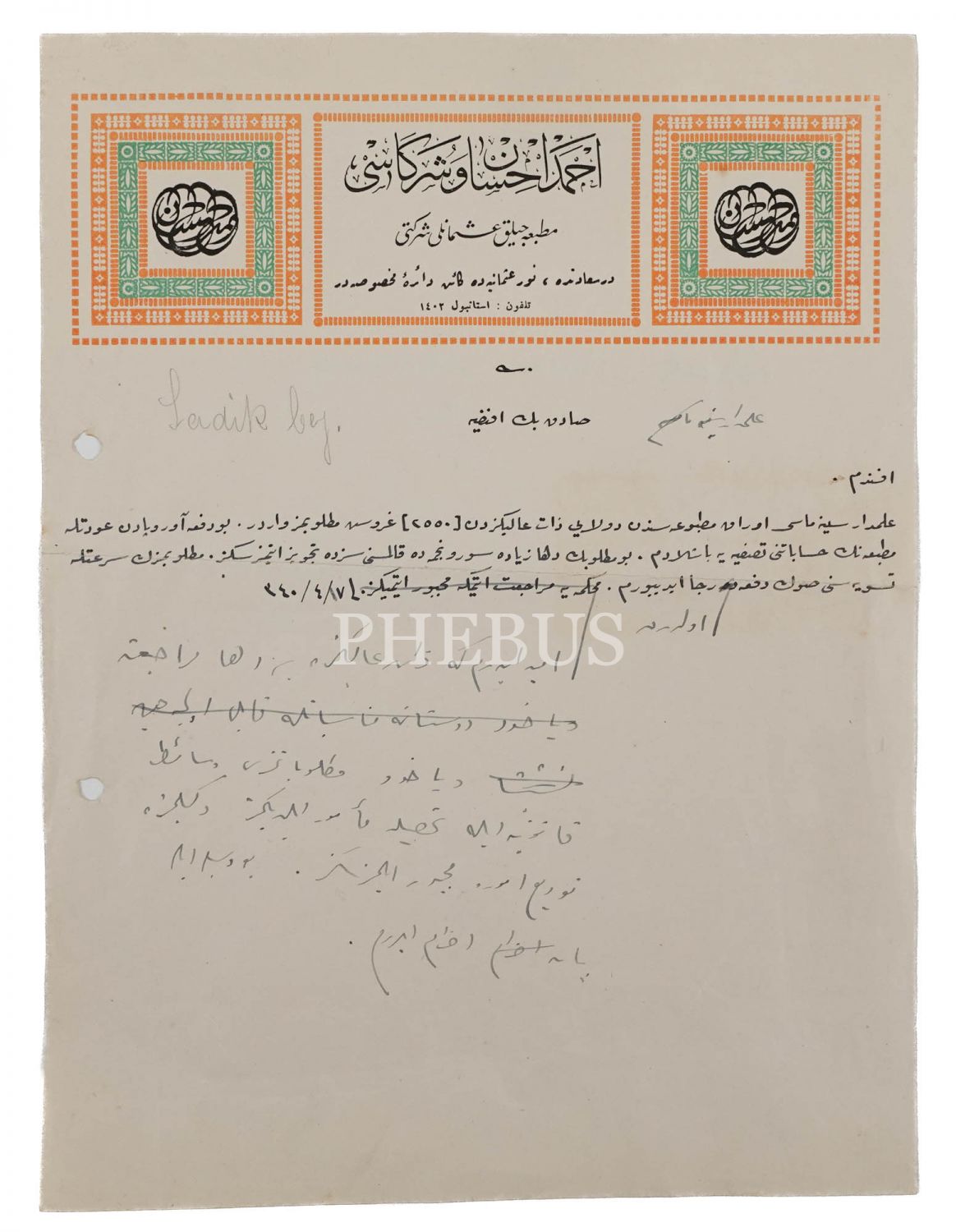 Türkiye´nin en eski sinemalarından biri olan Alemdar Sineması´nın sahibi Sadık Bey´e gönderilen, Alemdar Sineması´nın afişlerini basan Ahmet İhsan ve Şürekası Matbaacılık şirketine olan 2500 kuruşluk borcun ödemesinin geciktiğini ve bu ödeme için Sadık Bey´in son defa uyarılması hususunda kaleme alınmış, aksi takdirde mahkemeye müraacat edileceğini bildirir "Ahmed İhsan ve Şürekası Matbaacılık Osmanlı Şirketi" antetli mektup, 17 Haziran 1924, 21x27 cm...