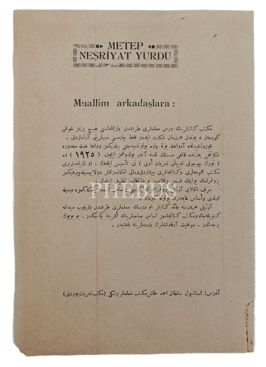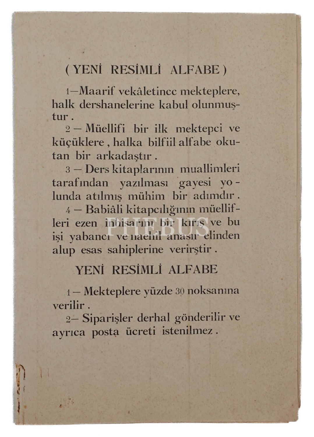 "Yeni Resimli Alfabe" kitabının eski ve yeni harfli tanıtım broşürü, (açık halde) 29x21 cm...
