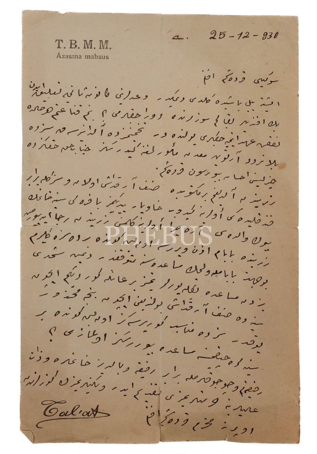 Türkiye Büyük Millet Meclisinin 2. döneminden 7. dönemine kadar milletvekilliği görevinde bulunmuş, İzmir Sultanisi´nde Edebiyat öğretmeni, şair ve yazar Ahmet Talat Onay´ın, "T.B.M.M. Azasına mahsus" antetli kağıt üzerine kaleme aldığı mektup, 14x22 cm...