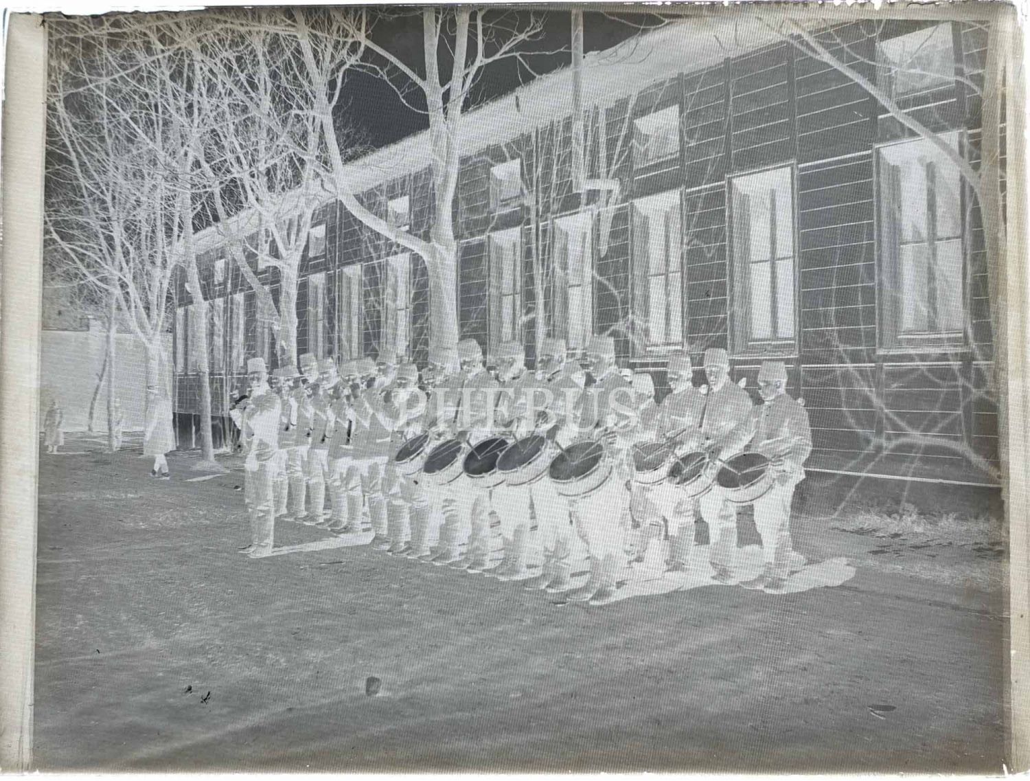 Osmanlı askeri bando takımının hatıra fotoğrafının cam negatifi, 12x9 cm...