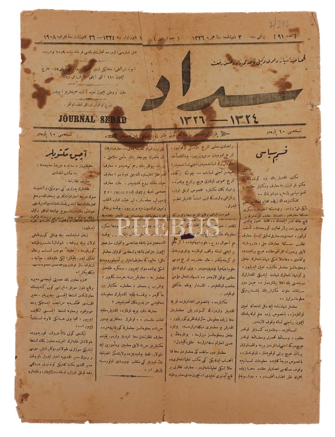 İzmir´de yayımlanan SEDAD gazetesinin 3 Zilhicce 1326 tarihli nüshası, 40x30 cm...