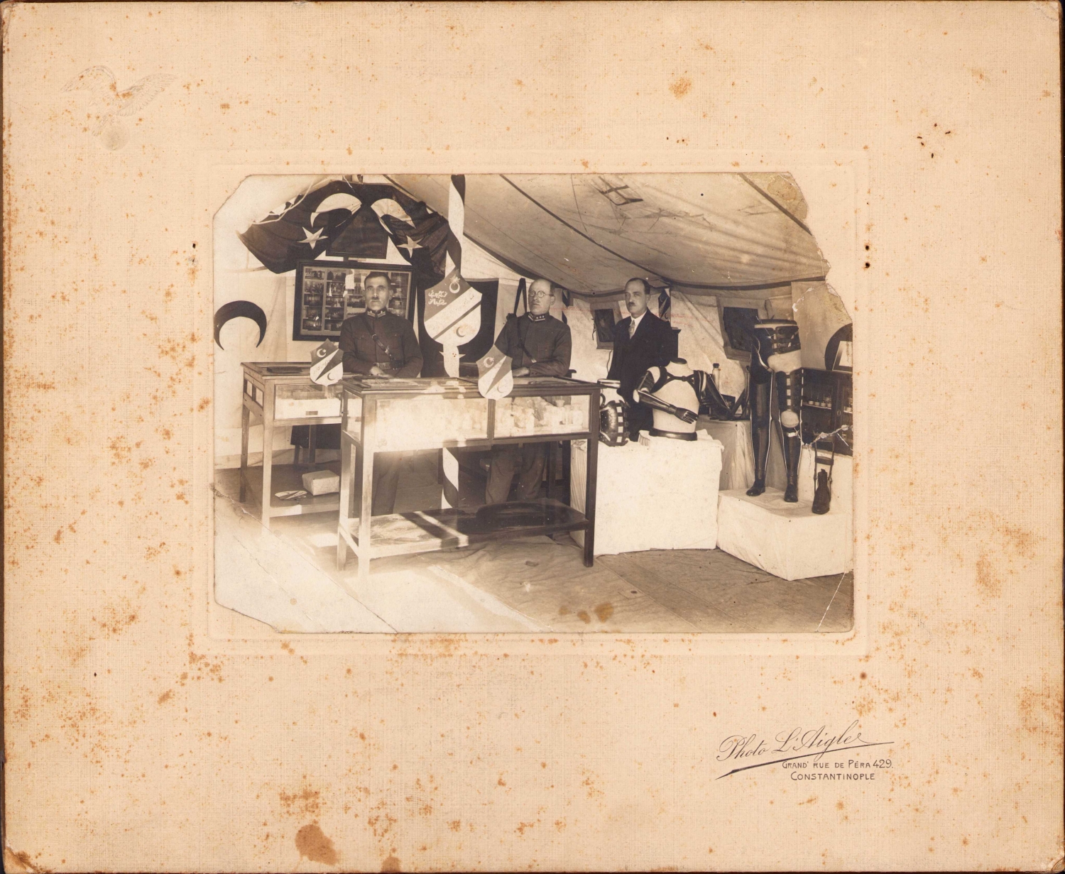 Çadır içerisinde Müdafaa-i Milliye Vekaleti ve Hilal-i Ahmer amblemleri, asker ve siviller ile sıhhi ürünler, 16,5x12 cm.