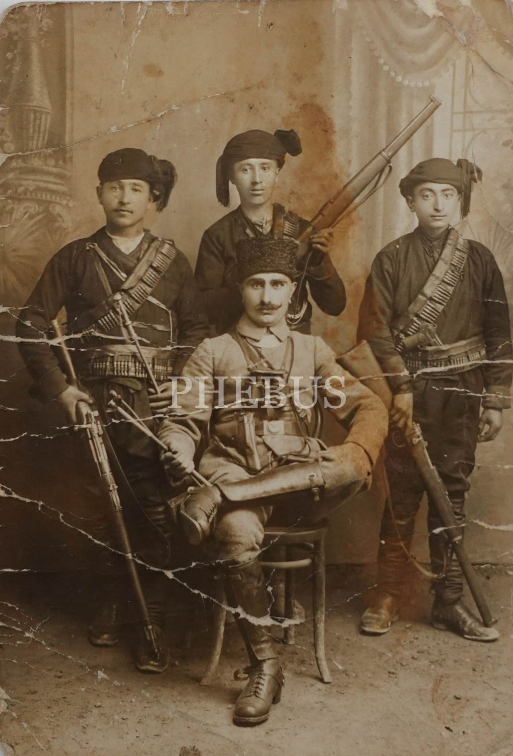 Tam techizatlı bir şekilde sandalyede oturan bir komutan ve etrafında ellerinde tüfekleri, bellerinde fişekleriyle poz veren Kuva-yı Milliye askerlerinin stüdyo hatıra fotoğrafı, 14x9 cm...