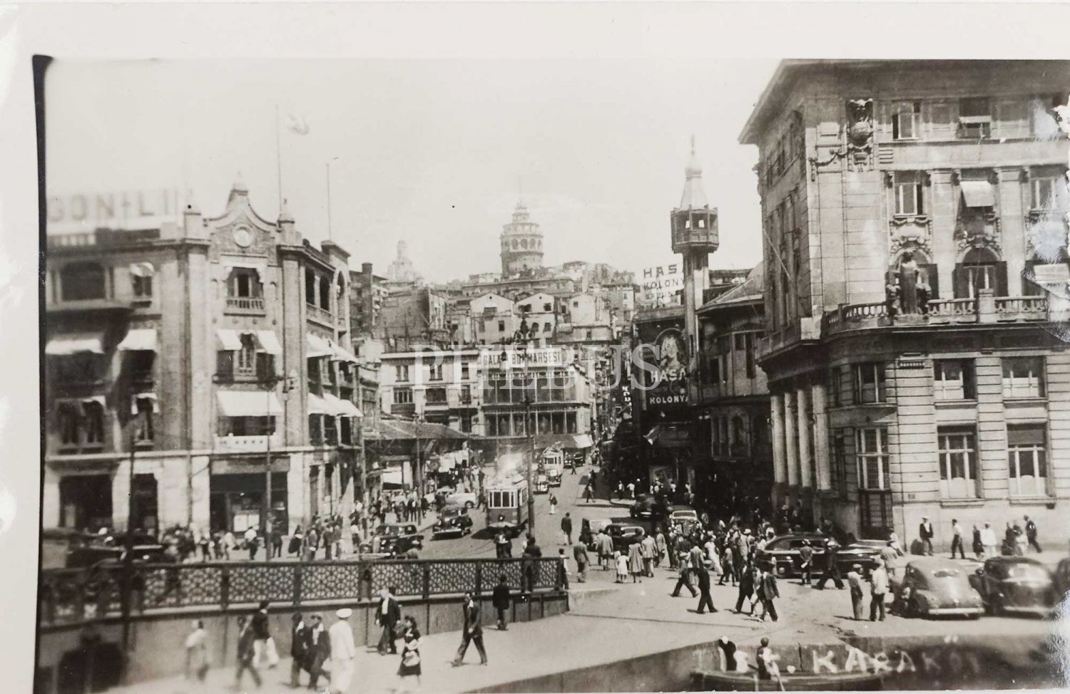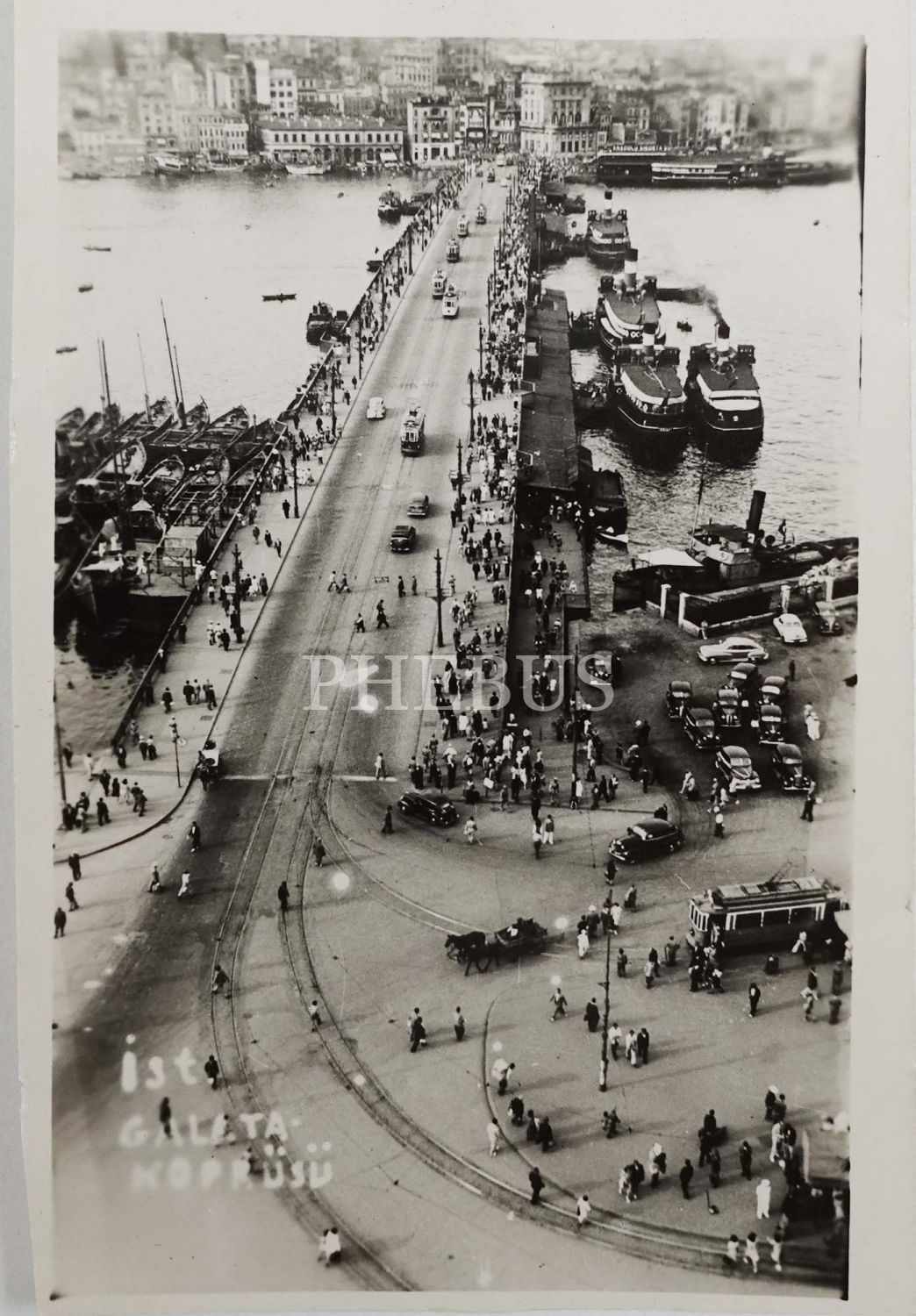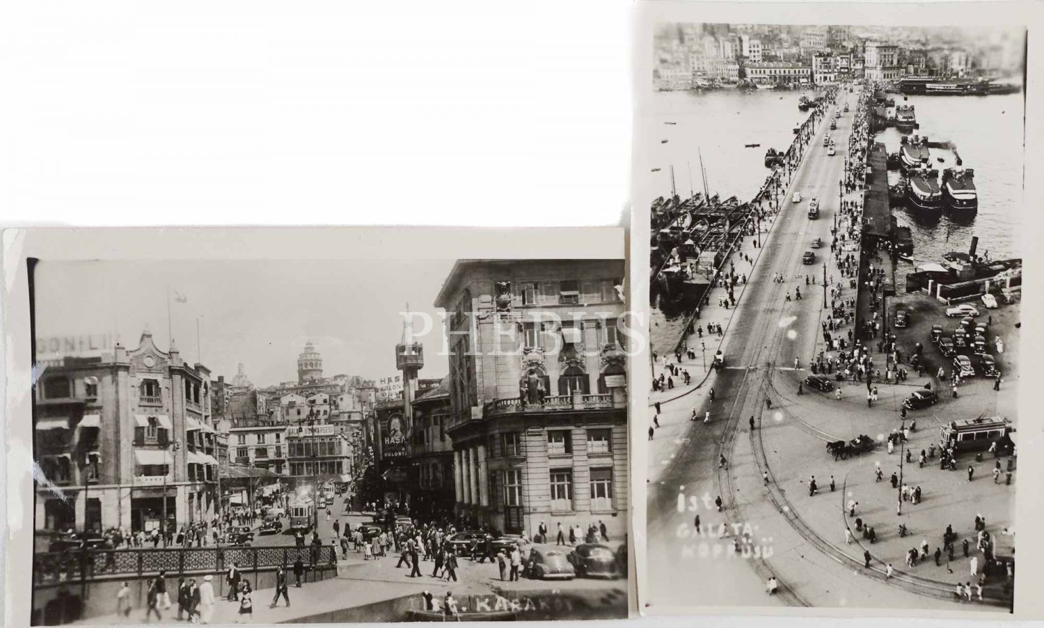 Günümüze ulaşamayan Merzifonlu Kara Mustafa Paşa Camii´nin de görüldüğü Karaköy Meydanı ile Galata Köprüsü´nün Eminönü tarafının, Erken Cumhuriyet dönemine ait İstanbul fotokartları, 9x6 cm...