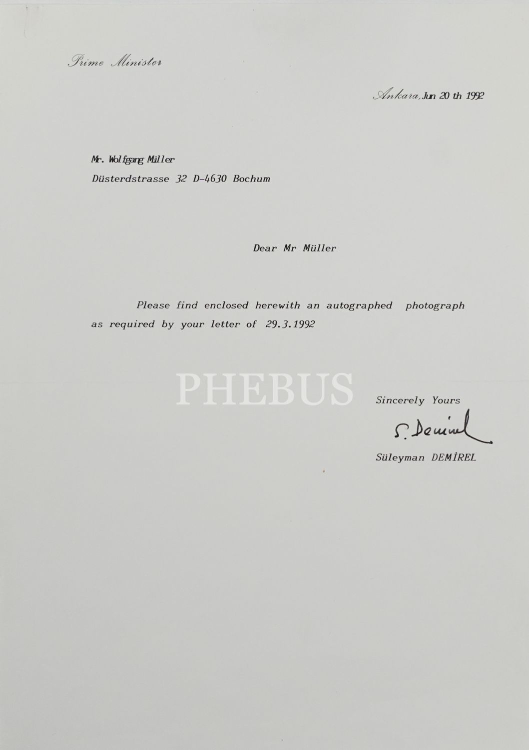 Süleyman Demirel´in, Wolfgang Müller isimli bir beyefendinin 29 Mart 1992 tarihli mektubunda talep ettiği imzalı fotoğrafı ekte sunduğunu bildirdiği, 20 Haziran 1992 tarihli cevap mektubu, Süleyman Demirel´den ıslak imzalı, 21x30 cm...