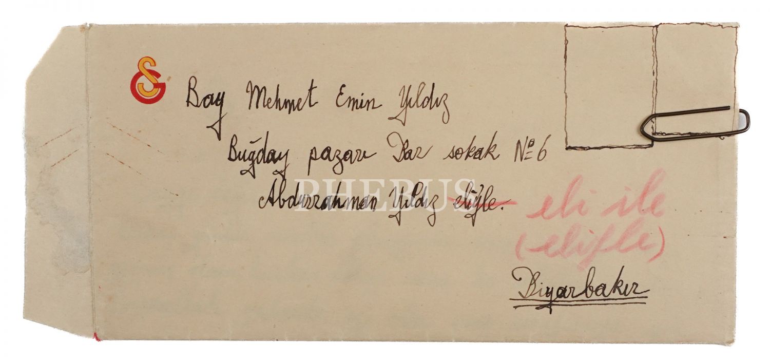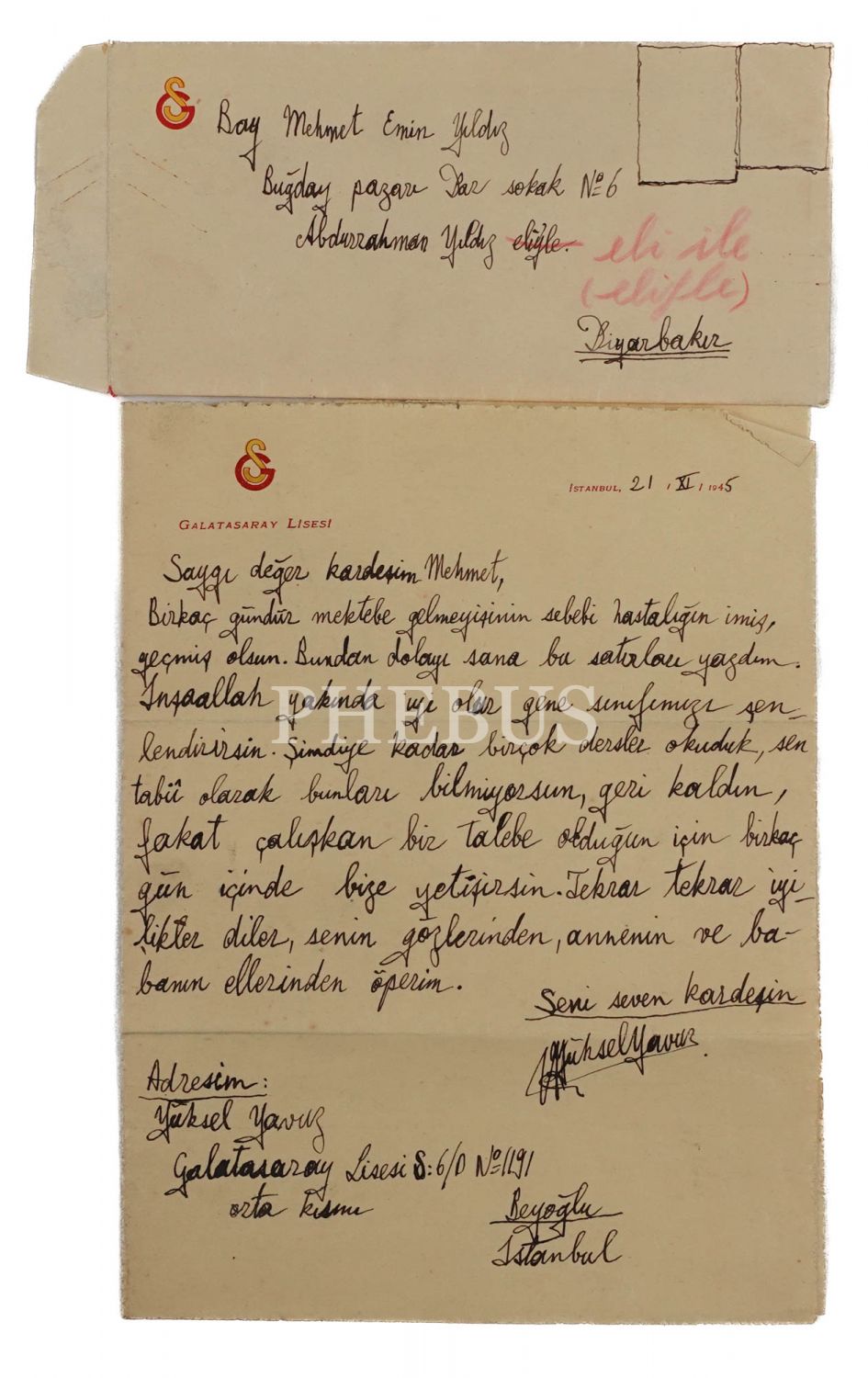 Galatasaray Lisesi logolu ve antetli zarf ve mektup kâğıdı ile bir öğrenciden bir başka öğrenciye gönderilmiş 1945 tarihli el yazısı mektup, zarf 16x8 cm, mektup 15x20 cm...