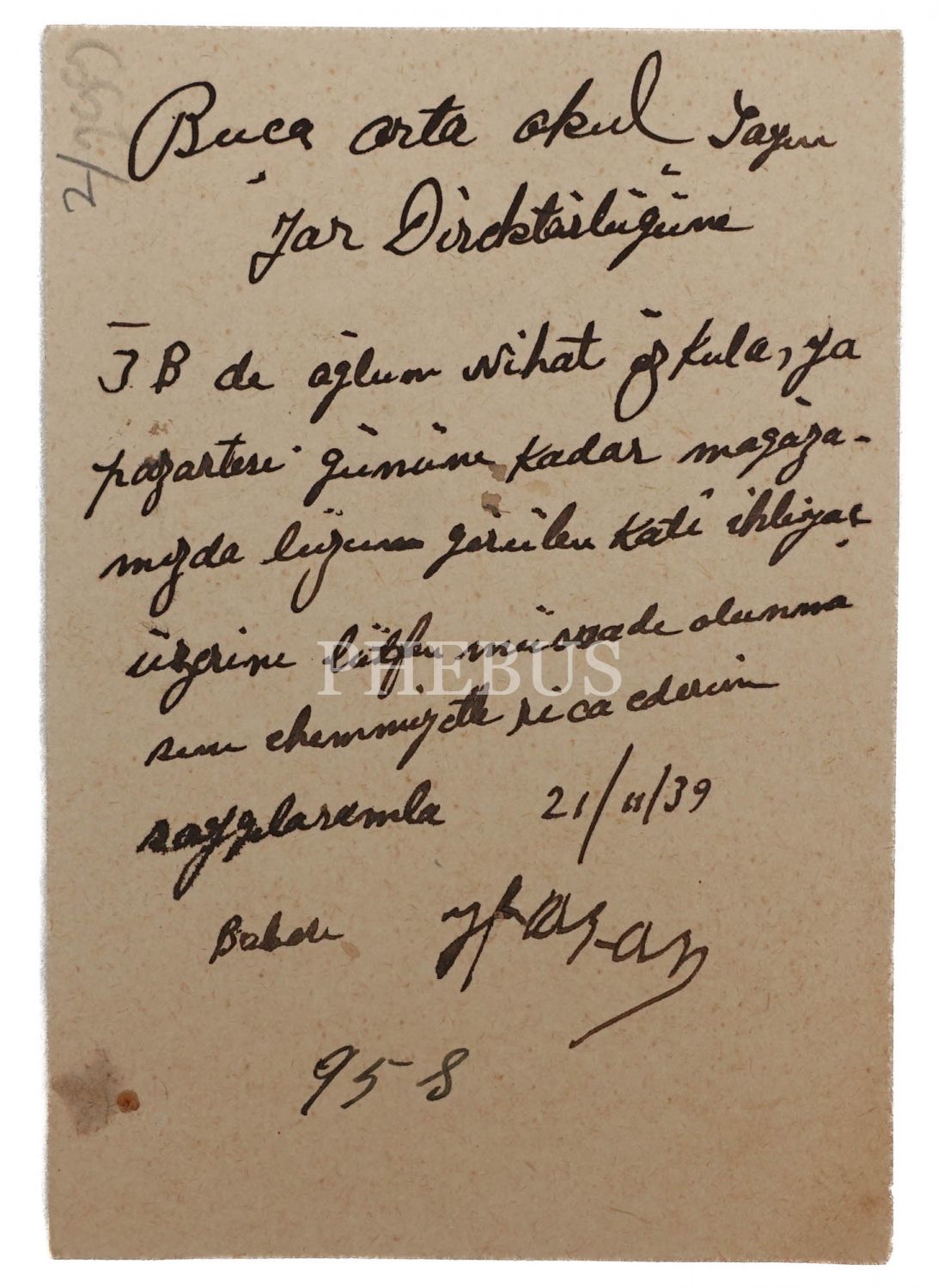 Ali Hasan Özkula tarafından 21 Şubat 1939 tarihinde yazılan ve imzalanan not, şu ifadeleri içermektedir: "Buca Orta Okul Sayın Yaz Direktörlüğüne, 3B´de oğlum Nihat Özkula´ya pazartesi gününe kadar mağazamızda lüzum görülen katî ihtiyaç üzerine lütfen/lütfu? müsaade olunmasını ehemmiyetle rica ederim. Saygılarımla. Babası Hasan"