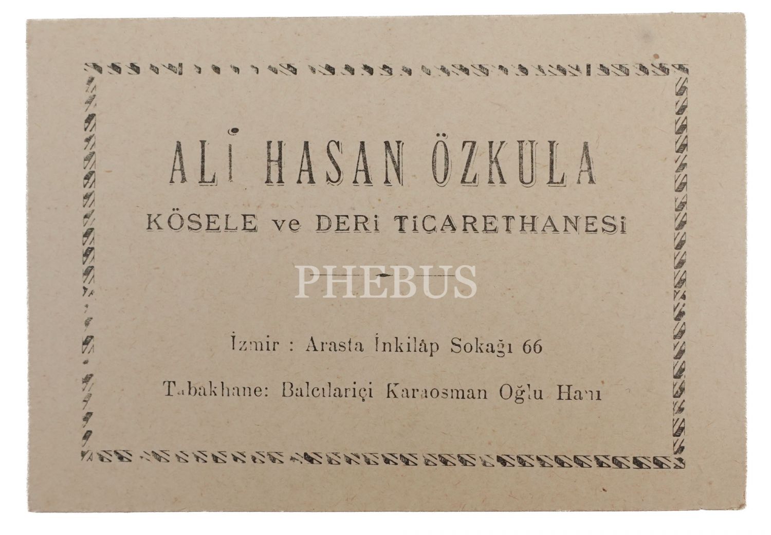 Ali Hasan Özkula - Kösele ve Deri Ticarethanesi (İzmir) işyeri kartı, arka yüzüne Hasan Bey tarafından, oğlu için okulundan izin rica ettiği bir not kaleme alınmıştır, 13x9 cm...