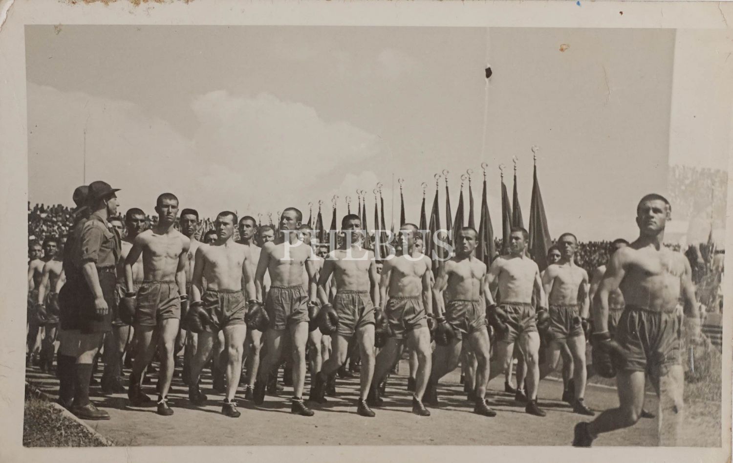Bir millî bayram töreninde Türk bayrakları eşliğinde yürüyüş yapan yağız delikanlılar, 14x9 cm...