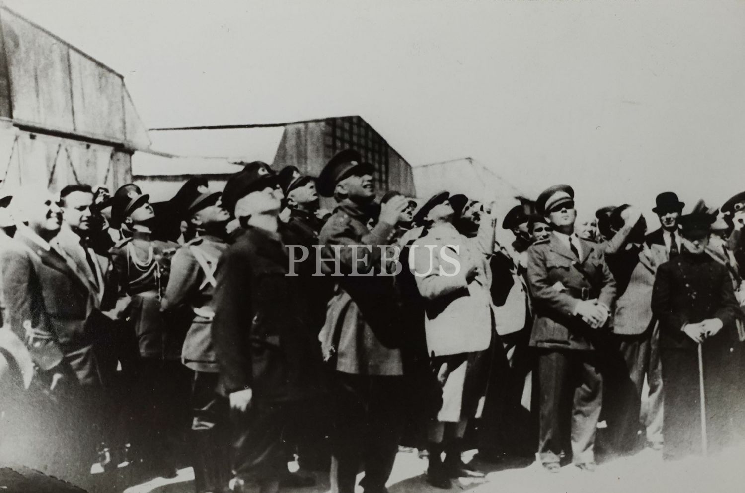 Mustafa Kemal Atatürk, İran Şahı Rıza Pehlevi ile birlikte Türk tayyarelerinin geçişini izlerken, 1934, 18x12 cm...