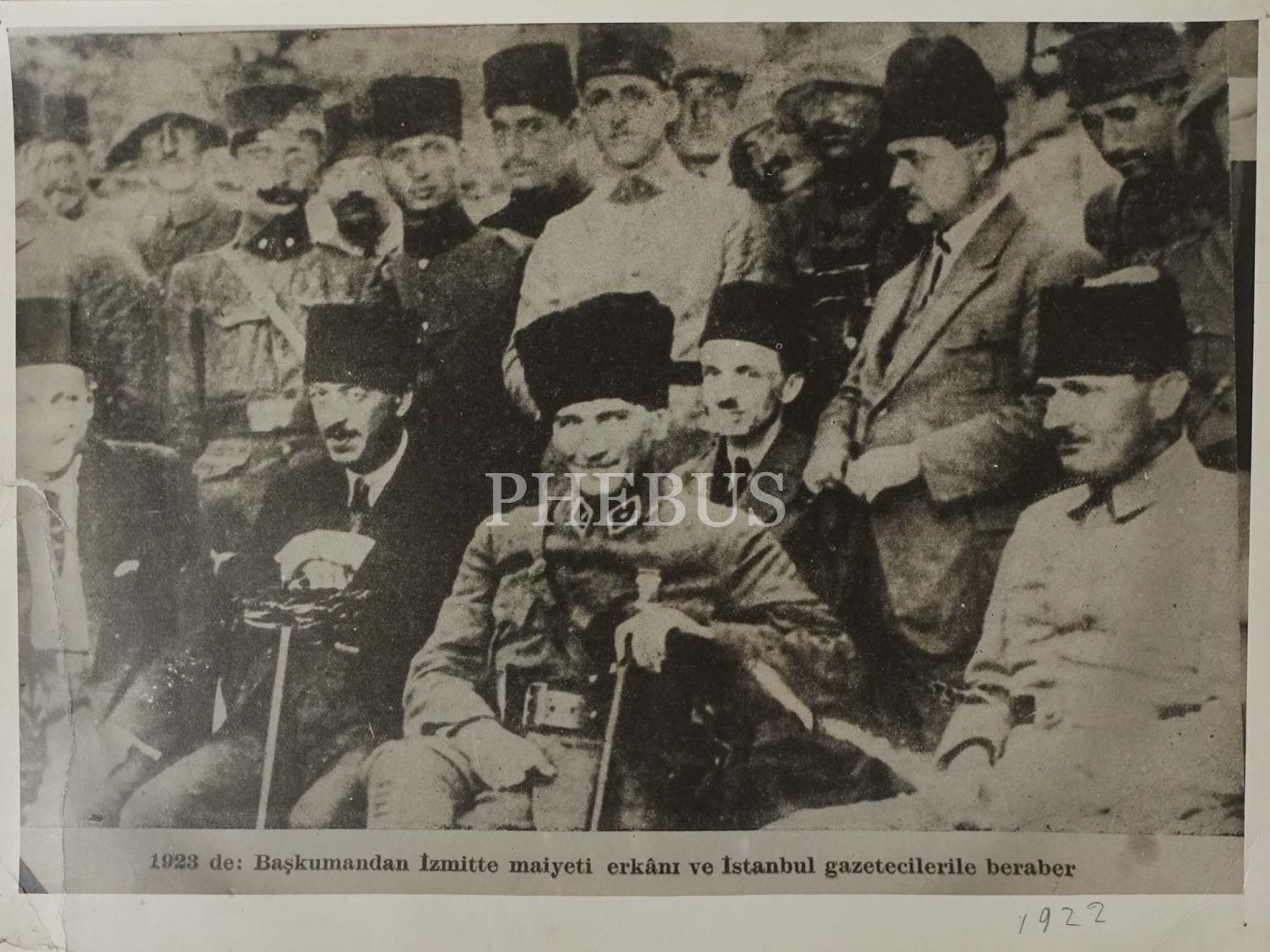 Mustafa Kemal Atatürk´ün İzmit´te, maiyetiyle ve İstanbullu gazetecilerle aldırdığı fotoğrafı, 1922, 37x28 cm...