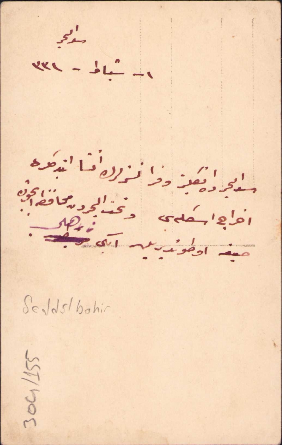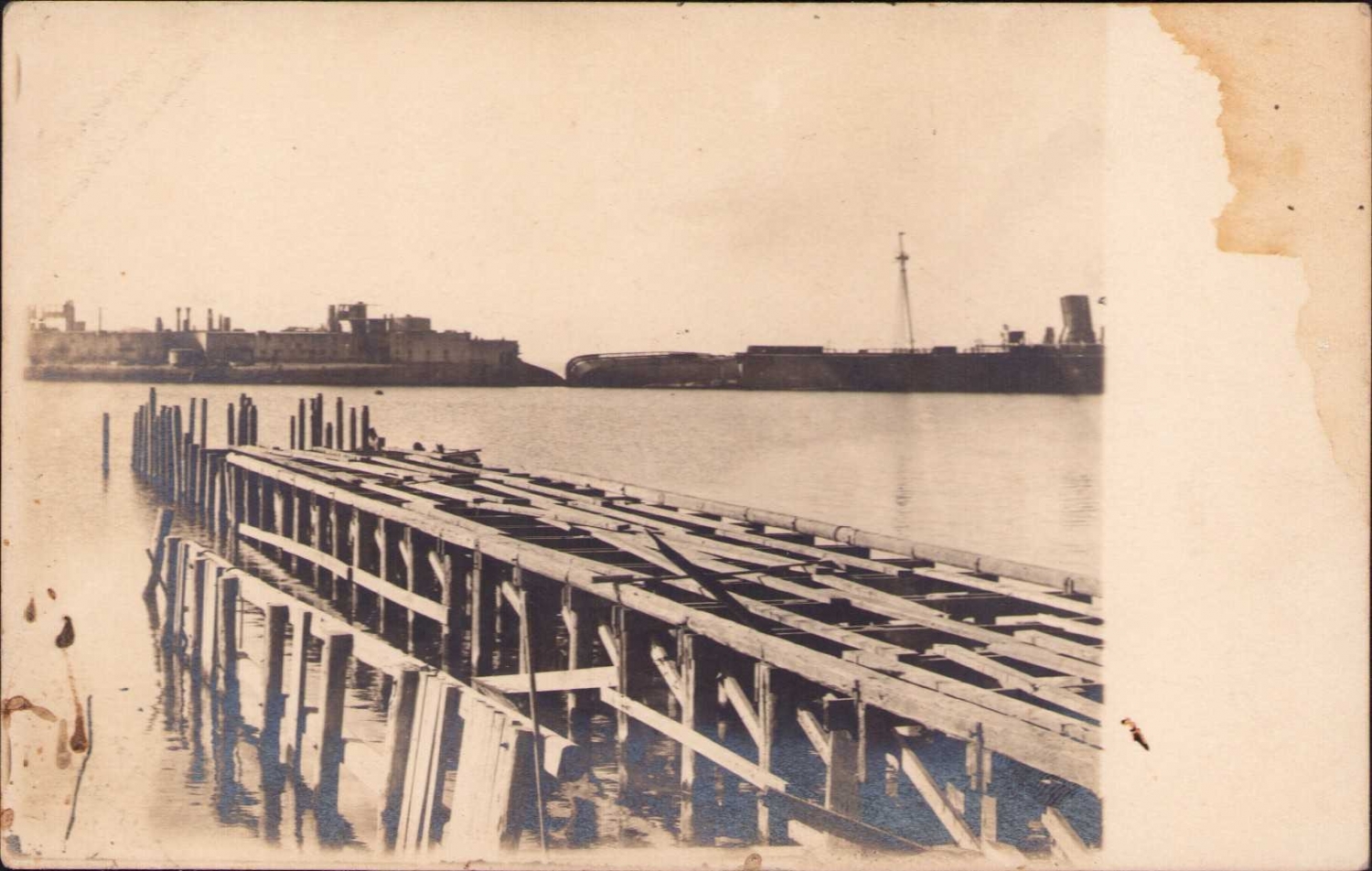 Seddü'l-Bahir'de [Çanakkale] İngiliz ve Fransızların inşa ettiği ihraç iskelesi ve gemi, arkası Osmanlıca yazılı.
