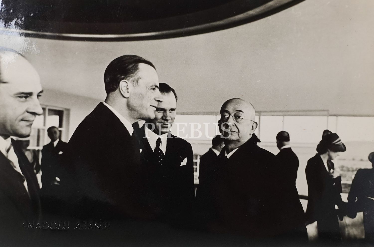 Refik Saydam, yabancı diplomatlar ile görüşmede, "Anadolu Ajansı" soğuk damgalı, 17x11 cm...