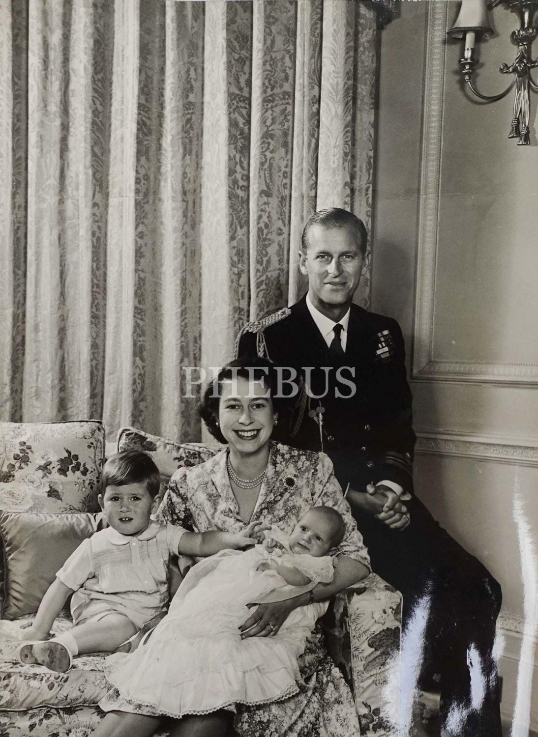 İngiltere Kraliçesi II. Elizabeth, eşi Prens Philip ve çocukları III. Charles ve Prenses Anne ile birlikte, arka yüzü "İngiliz Basın Bürosu" ve "Camera Press Ltd." damgalı, 15x21 cm...