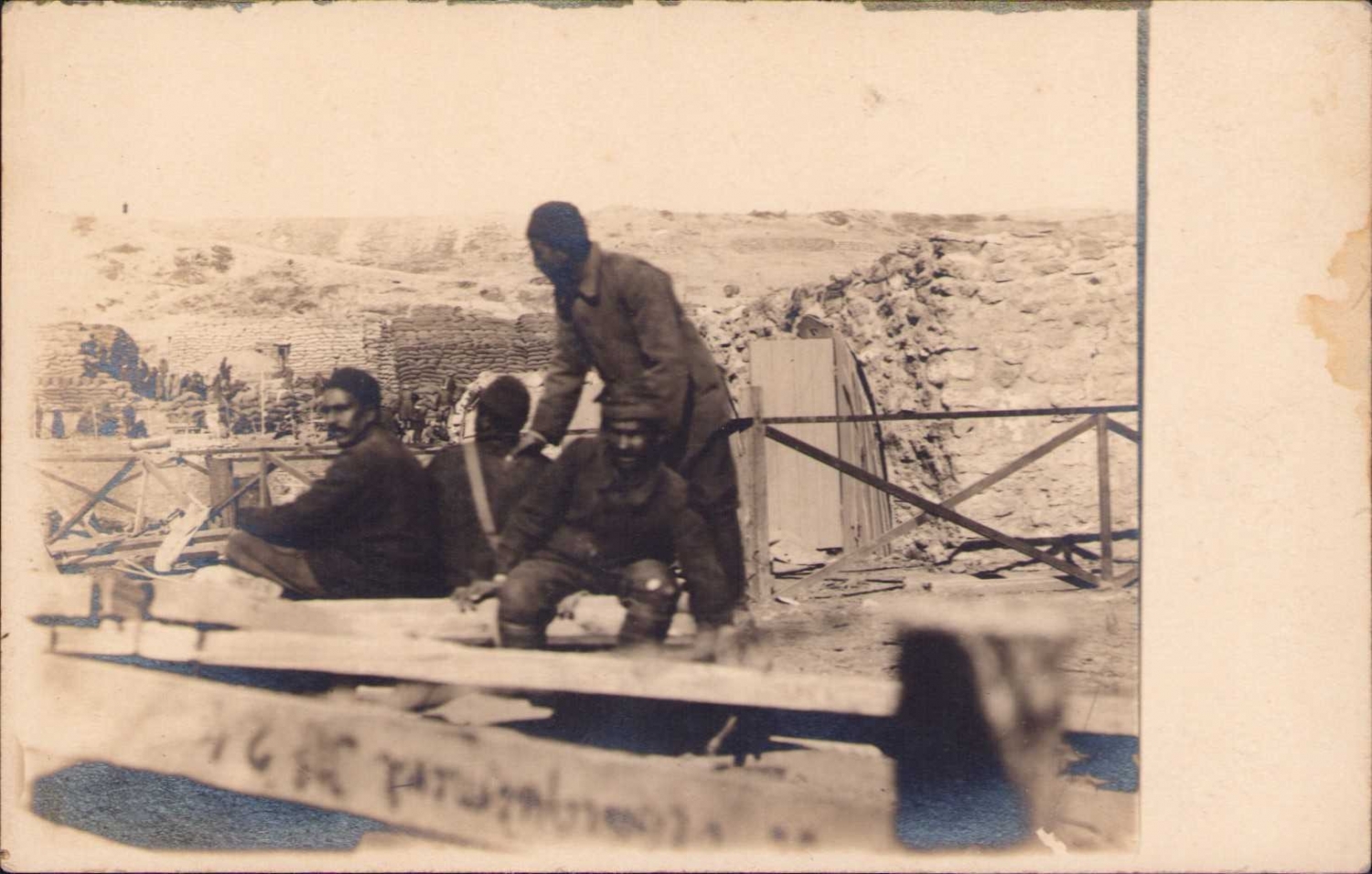 Seddü'l Bahir'de [Çanakkale] ihraç iskelesinde İngiliz ve Fransızların bıraktıkları buğday ve arpalar, Arkası Osmanlıca yazılı.