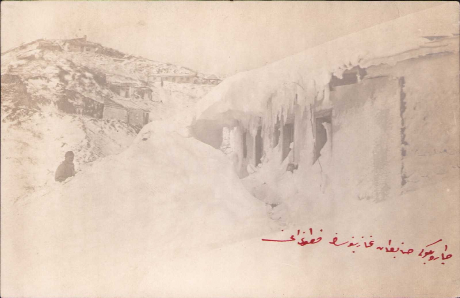 1. Cihan Harbi Çanakkale, kar altında Tayyare Bölüğü Zabitan Gazinosu.