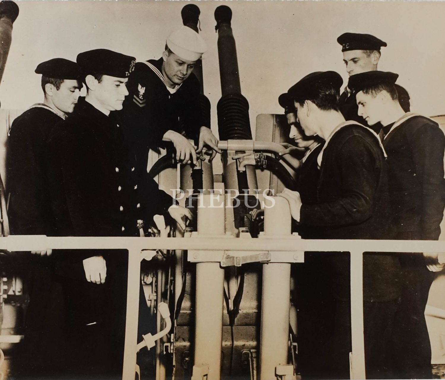 "Birleşik Amerika Deniz Kuvvetlerine ait gemilerin Türkiye´ye tesliminden evvel 40 milimetrelik top etrafında toplanan Türk denizcileri bir Amerikalı erbaşın verdiği izahatı dinliyorlar", 14x12 cm...