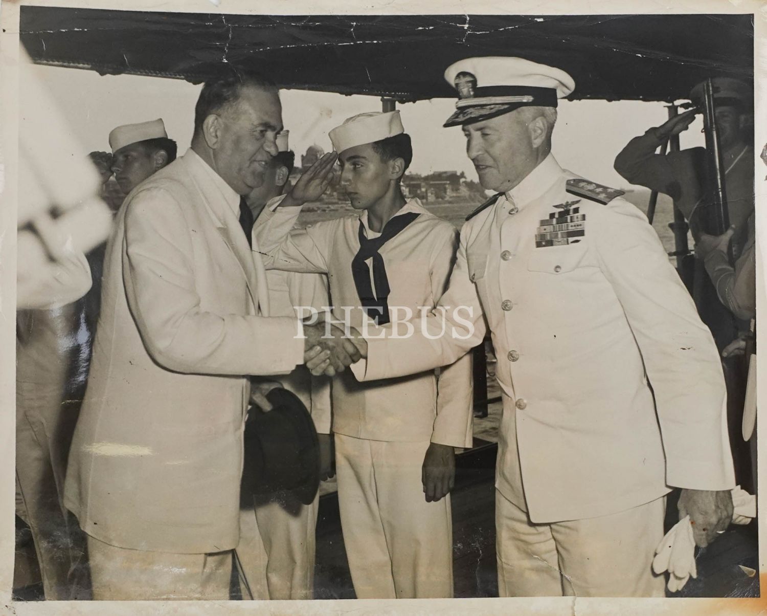 "İstanbul´u ziyaret eden Amerikan Filosu Komutanı Tümamiral Forrest Sherman, Vali Dr. Lütfi Kırdar´ı gemide selamlarken", 26x21 cm...